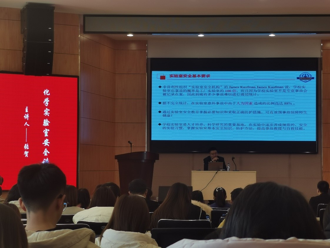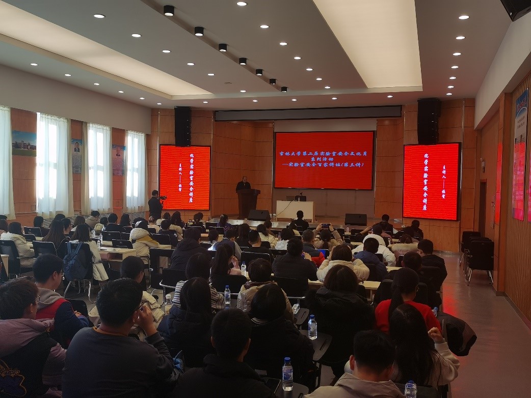 讲座的第一部分为化学类实验室安全讲座,由我校化学学院副院长张贺主讲,张贺结合多起由危险化学品引发事故的典型案例,深入分析了实验室用电、用火、危险化学试剂管理等方面可能存在的潜在危险,为参会师生树立了预防为主、未雨绸缪的指导思想。讲座第二部分由广州德标智能化工程有限公司的戴红军主讲,戴红军以《实验室气体安全讲座》为题,重点介绍了有毒气体、易燃易爆气体、惰性气体等可能造成的危害,并对高校实验室气体钢瓶的常见隐患进行了分析。讲座第三部分由长春奥狮环境监测有限公司的刘宇臣主讲,讲座内容包括电离辐射的类型、电离辐射的危害、电离辐射的防护等方面知识。