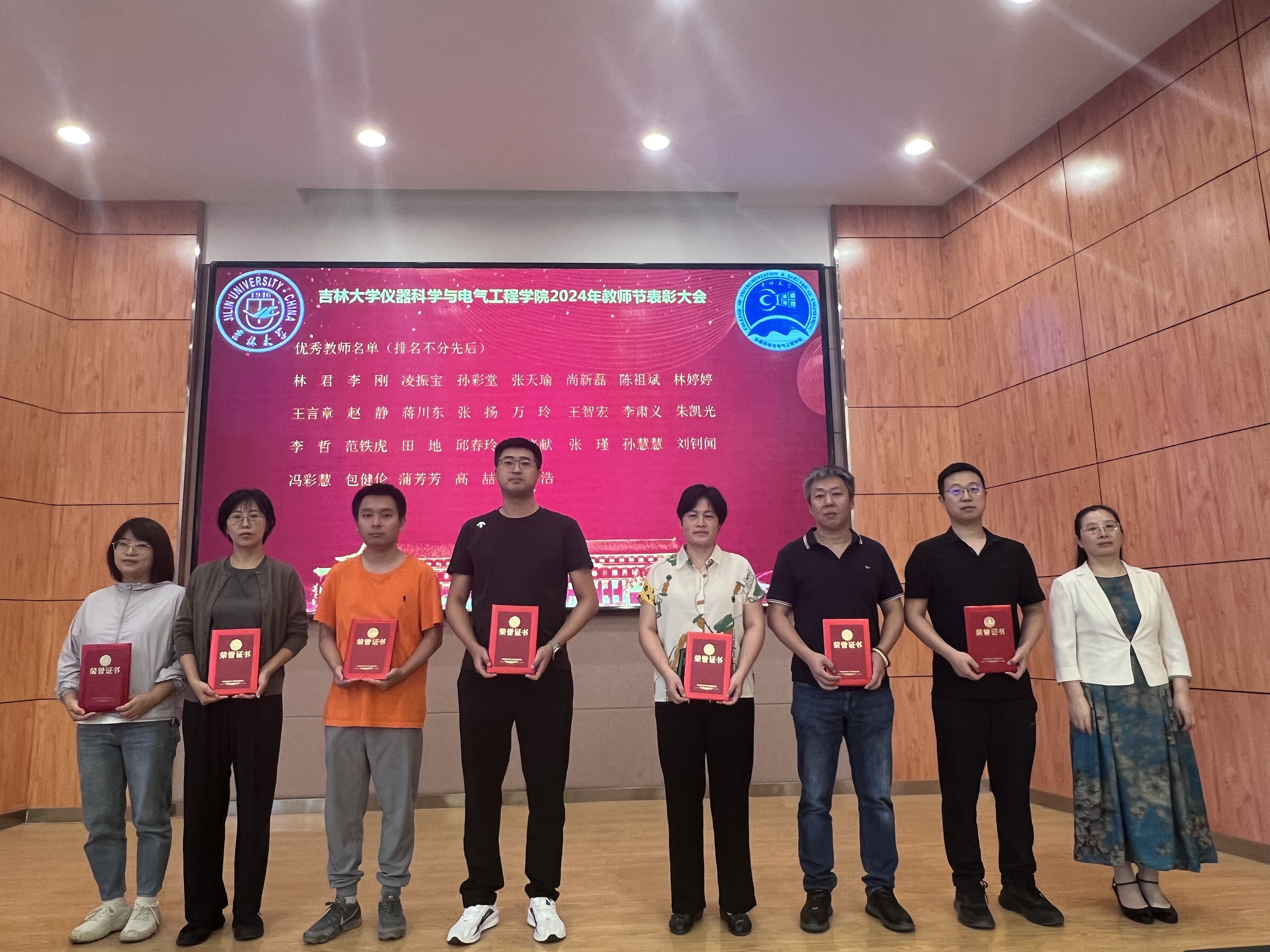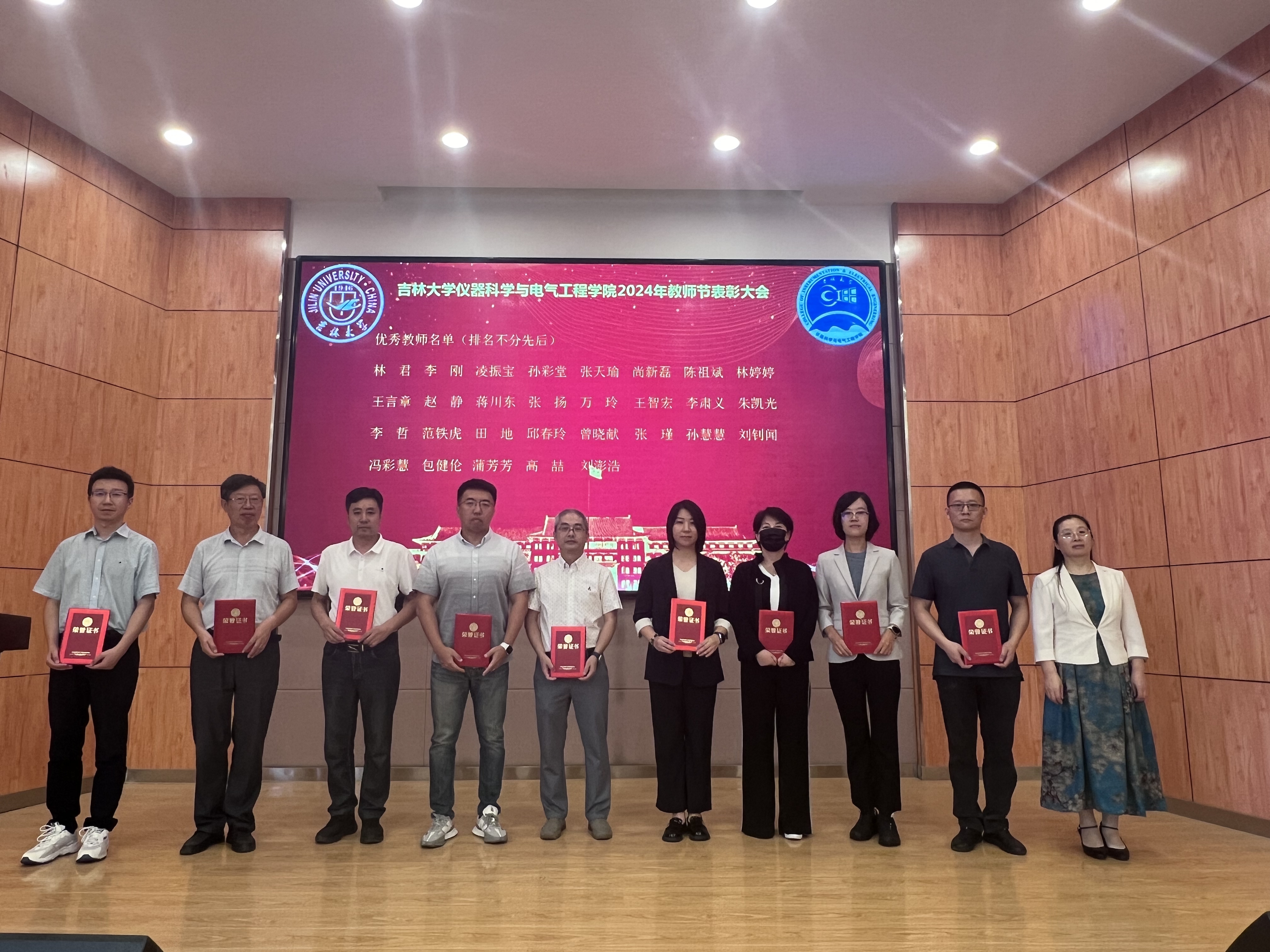 大会在庄严的国歌声中拉开序幕。会上,学院党委书记邱增凯代表学院领导班子向全院教师致以诚挚的节日问候。邱增凯表示,在过去的一年中,学院教师始终牢记立德树人根本任务,践行教育家精神,不断书写教书育人的新故事。随后,邱增凯宣读表彰决定。受表彰的教师中,有的潜心教书育人、高效赋能课堂,有的秉持科研初心、科研成果丰富,有的不断创新思路方法、持续提升教学水平,有的深耕专业、努力打造精品教材。院长嵇艳鞠为受表彰的教师代表颁发了荣誉证书,并与他们合影留念。