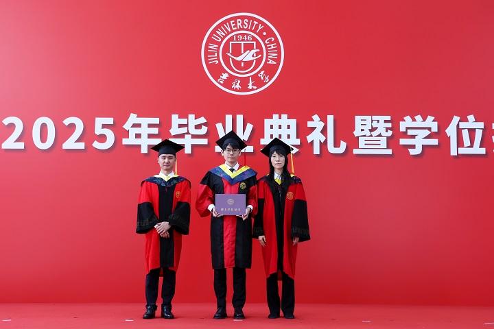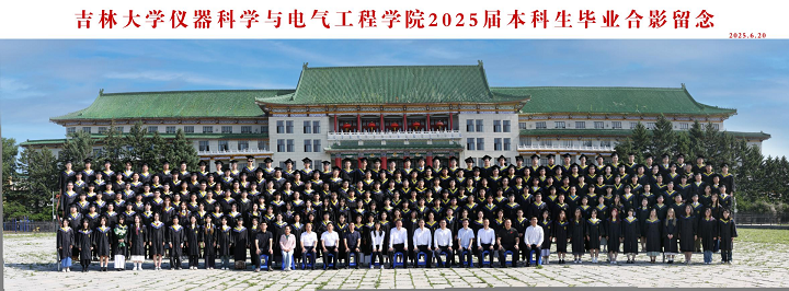 毕业典礼前,学院领导班子全体成员、教师代表与学院2025届毕业生在地质宫正门广场合影留念。