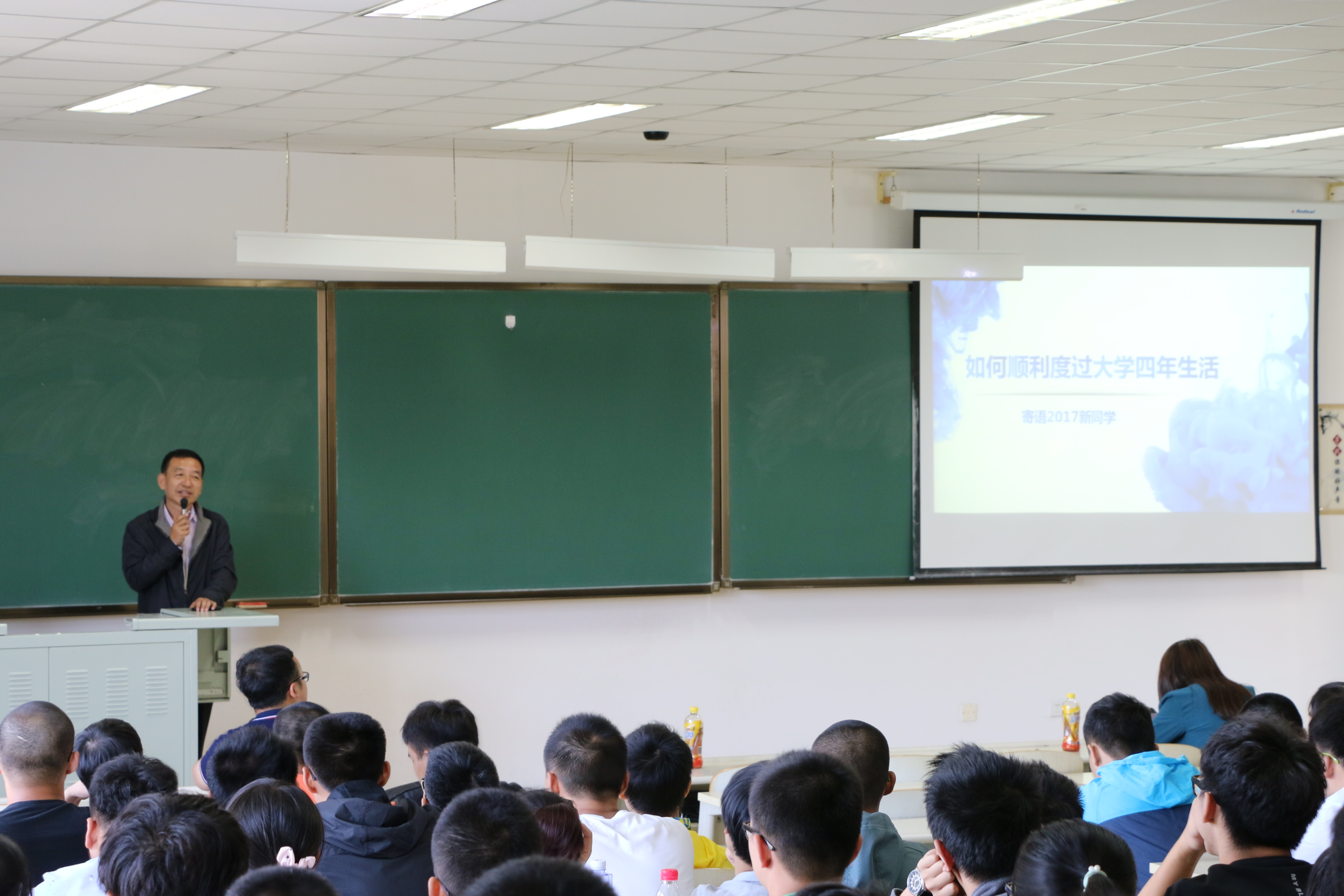 党委书记王爱民以“如何顺利度过大学四年生活”为主题为2017级新生进行了一场生动的讲座,讲座于我校前卫南区李四光楼104室举行。
