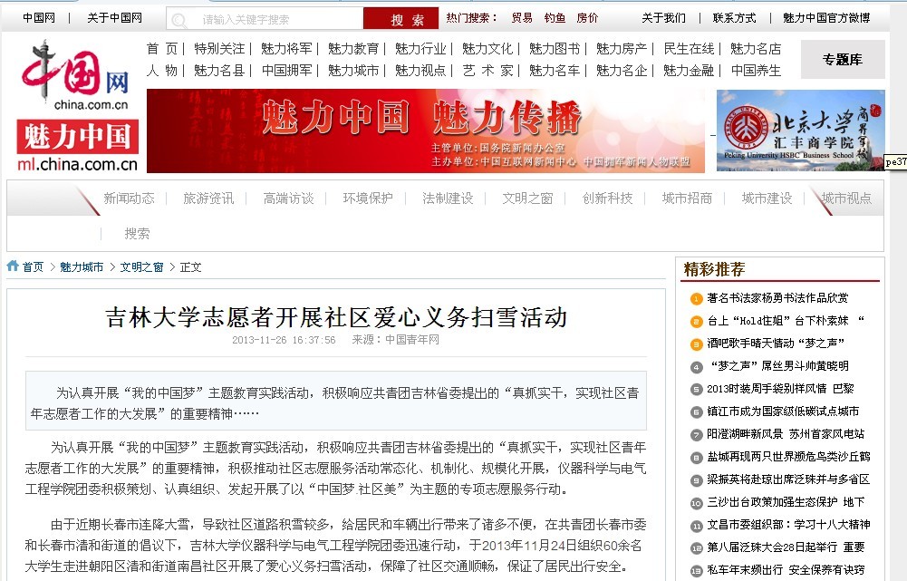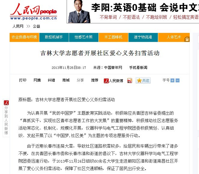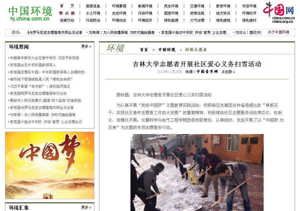 共青团工作今年第3次受到中国青年网的关注报道。此后,人民网、中国网、中国环境网、中华慈善新闻网、新浪吉林网、成都志愿者网等社会主流媒体纷纷对此进行了全文转载报道。