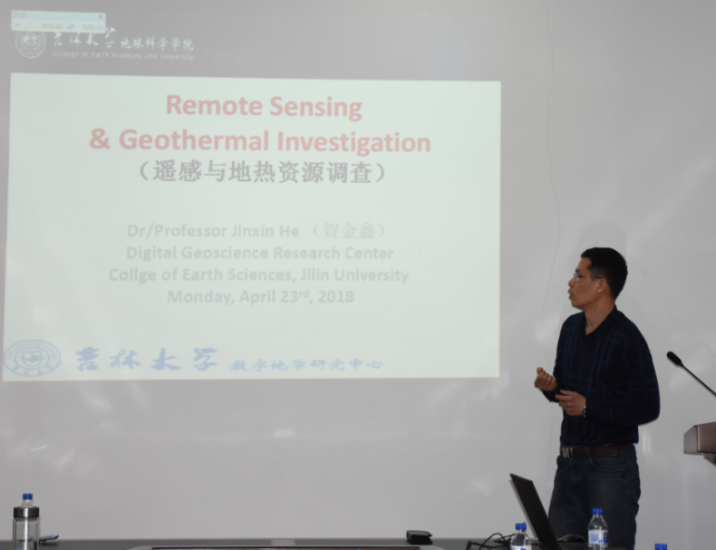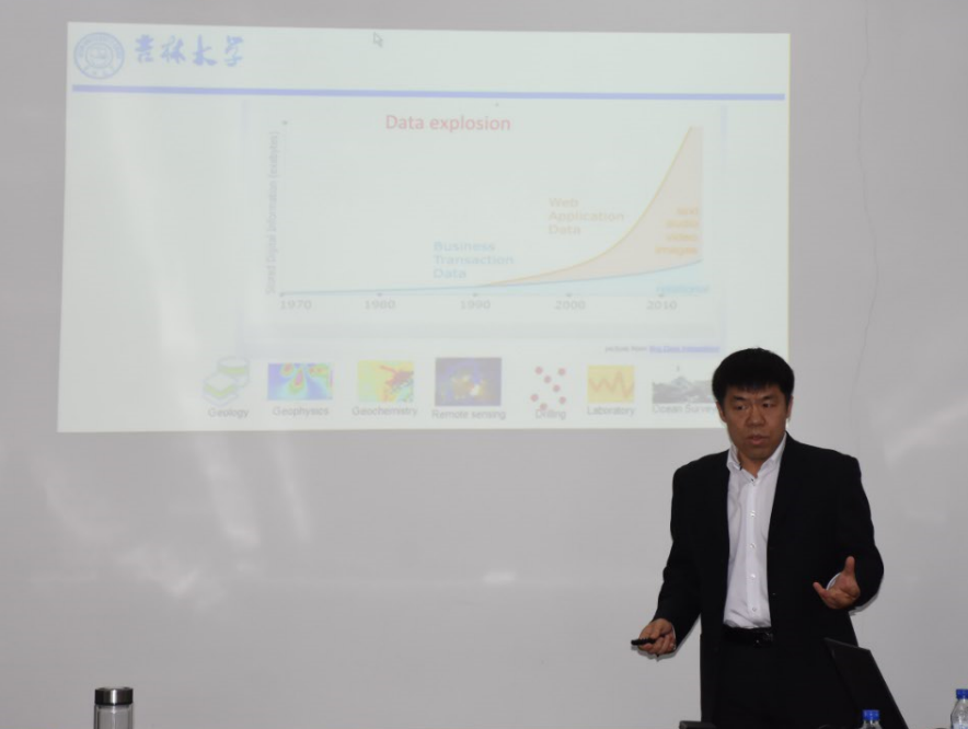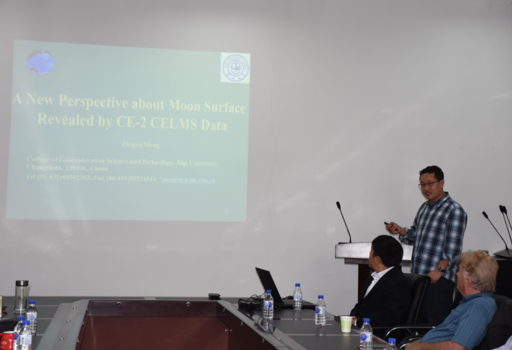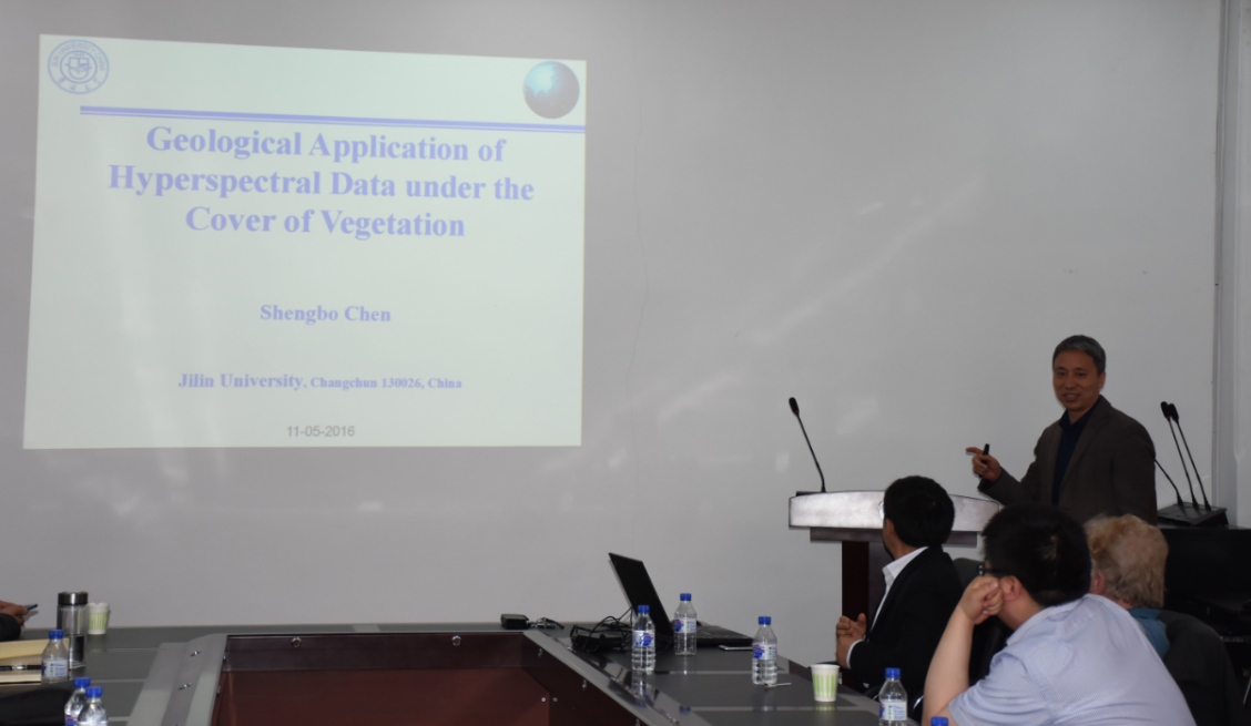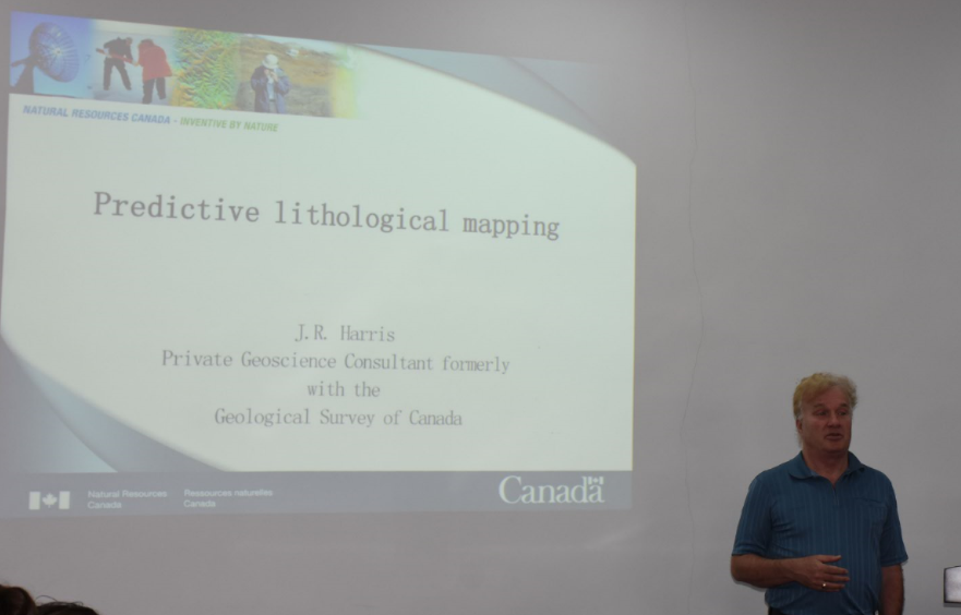上午的研讨会共安排了涉及遥感、地热、地球化学、大数据、信息提取、地质编图等方面的7个学术报告:“Remote predictive mapping using remotely sense, geophysical, geologic and geochemical data for geological mapping”(Jeoff Harris)、“Mineral potential modelling : Examples from Canada”(Jeoff Harris)、“Geo-information extraction and integration in support of mineral exploration”(王文磊)、“The geologic applications of hyperspectral remote sensing in vegetation covered areas”(陈圣波)、“A New Perspective about Moon Surface Revealed by CE-2 CELMS Data”(孟治国)、“Remote sensing and geothermal investigation”(贺金鑫)、“Introduction to big data, cloud computing and machine learning in China Geological Survey”(王永志)。