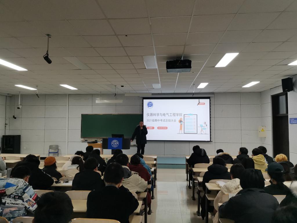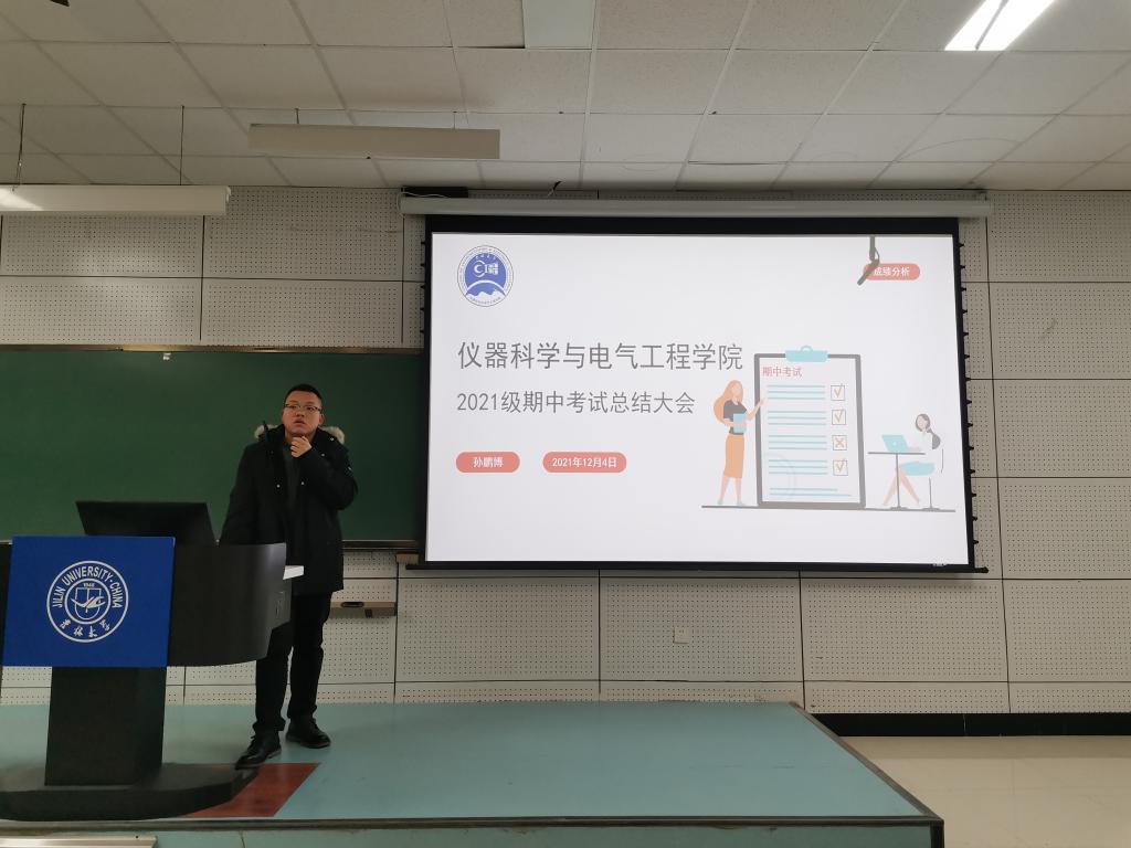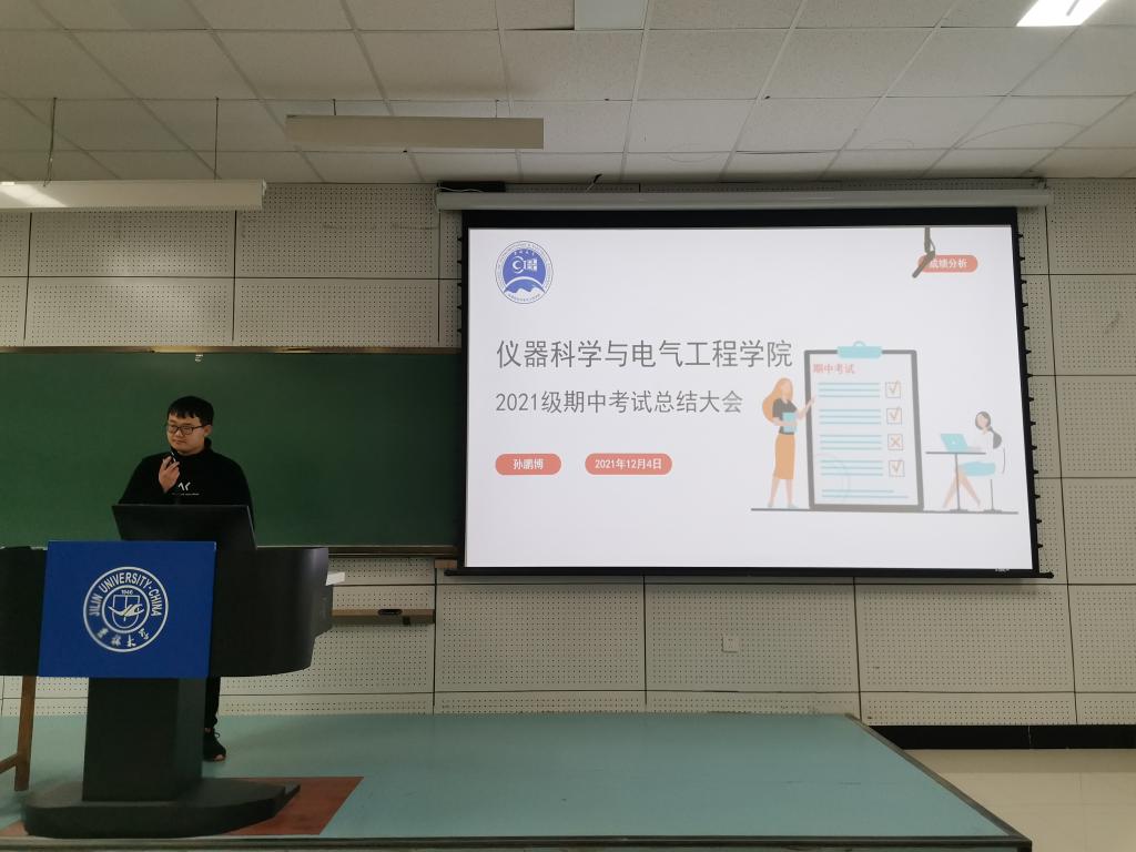 在李四光楼104教室组织开展2021级学生期中考试总结大会,辅导员孙鹏博老师对本次期中考试进行了总结。