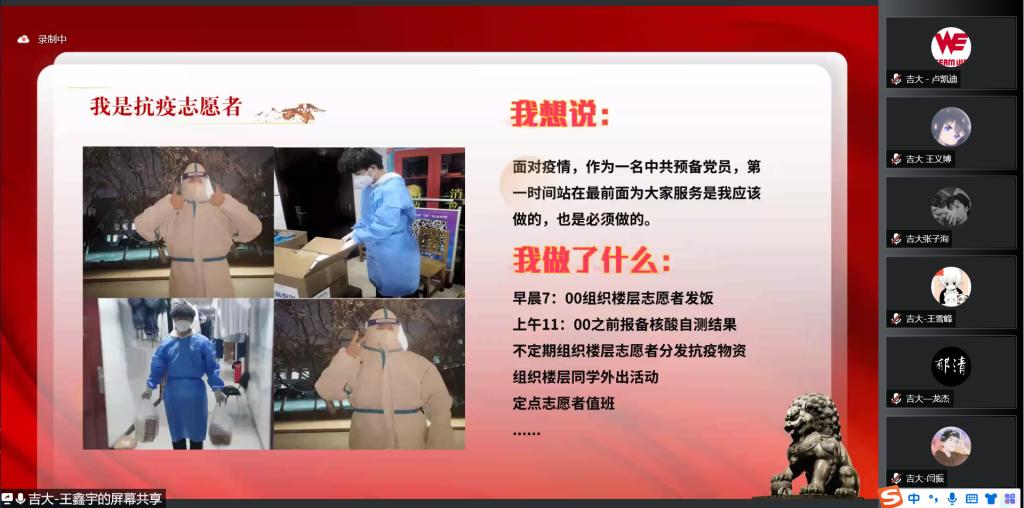 抗疫志愿者代表分享广大师生在抗疫过程中的先进事迹和宝贵经验。郝毅、王鑫宇、赵梦珂、胡玮桐同学分别从个人和集体两个角度出发,分享了在校园封闭管理期间的抗疫日记和志愿服务经历,吉大学子守望相助、封校不停学,学生党员积极投身防疫一线,践行着新时代青年的初心与使命。听完污污漫画