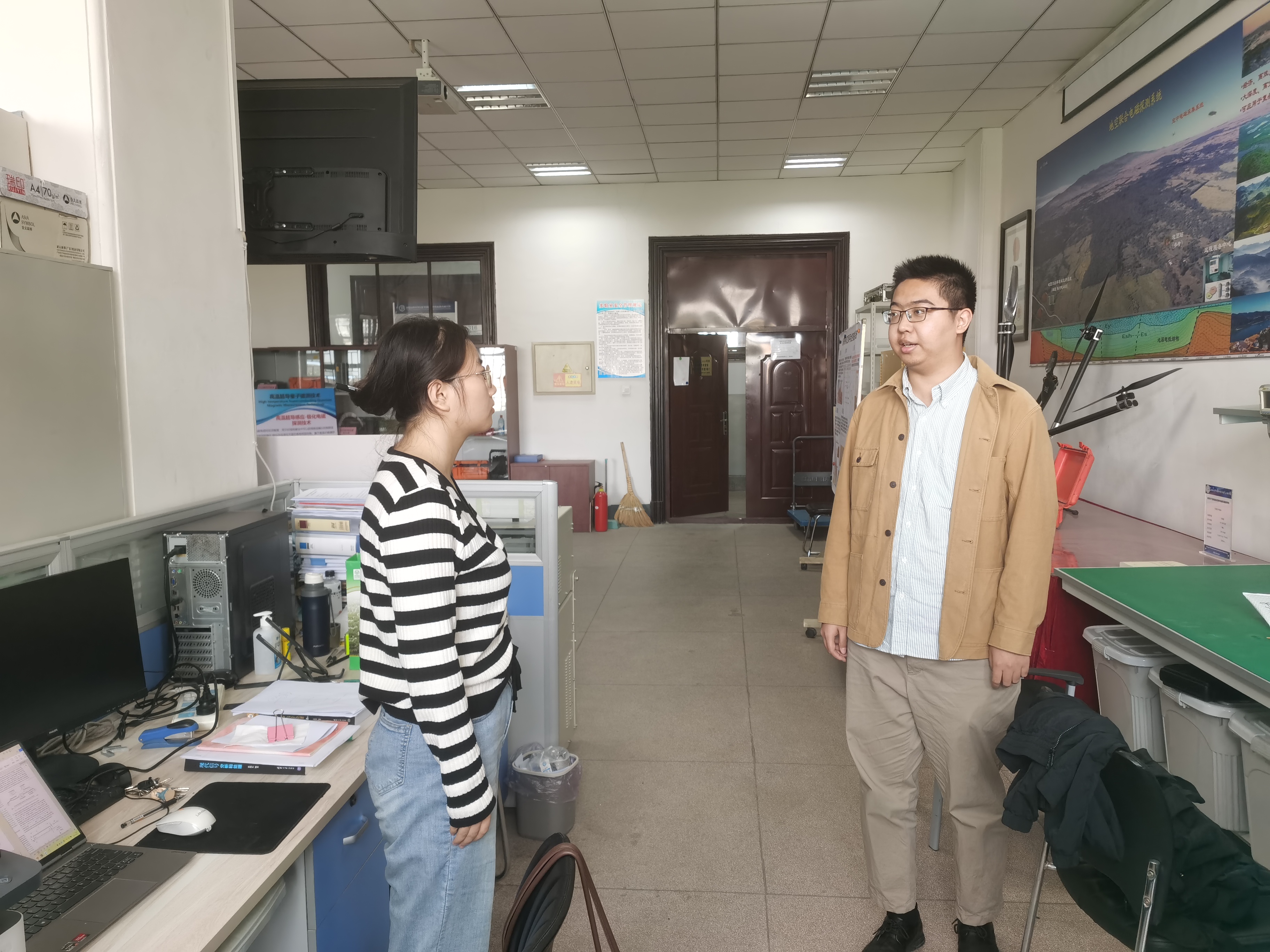 在朝阳校区地质宫,周琪老师与正在开展科研活动的研究生进行现场交流,提醒研究生要严格遵守实验室安全管理工作规定,规范操作实验设备。