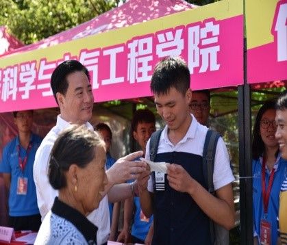 迎新工作点,正逢一新生和家人来到迎新地点报道,李元元校长与年迈奶奶进行亲切交谈,李元元校长向奶奶介绍了污污漫画
