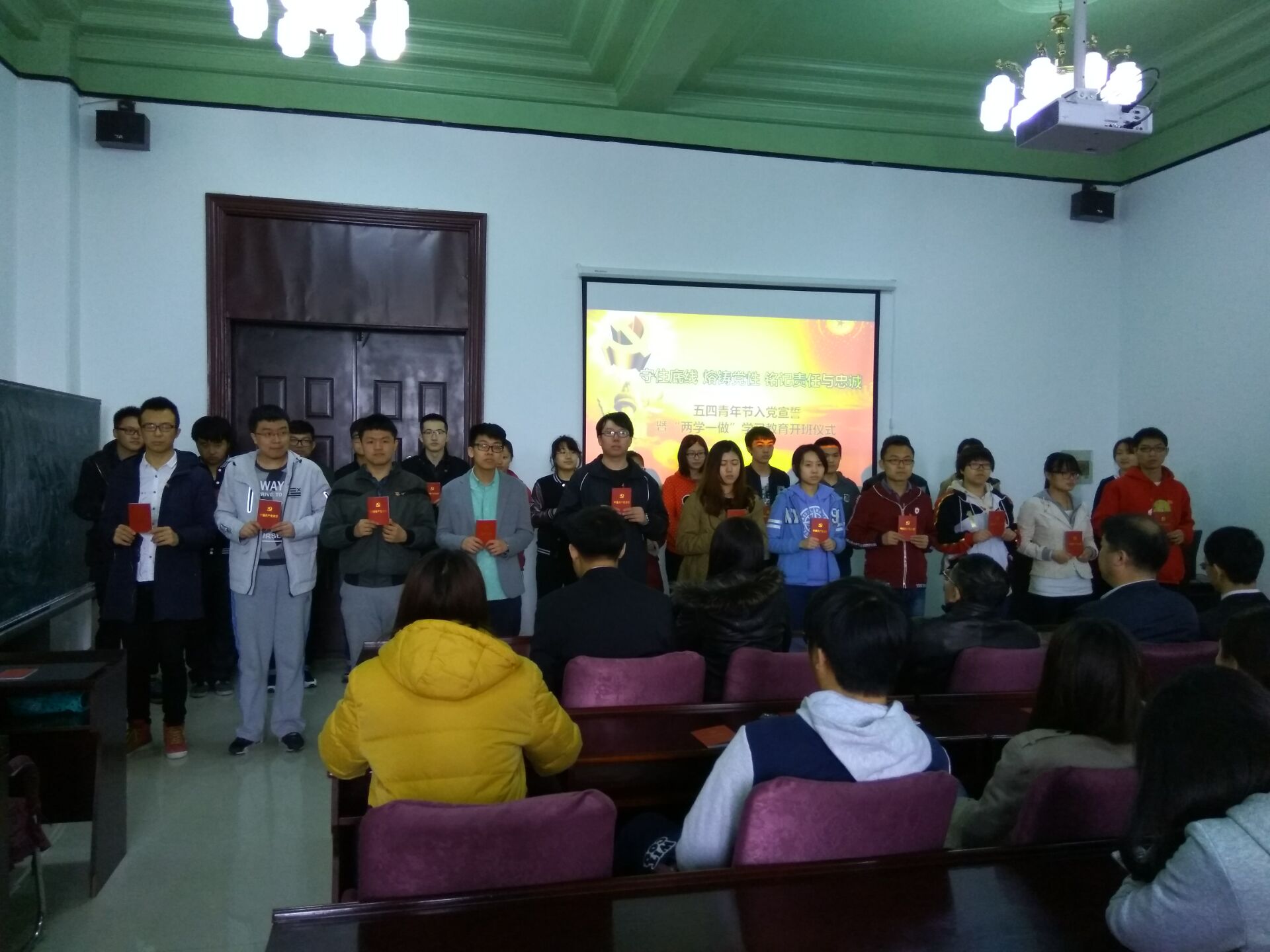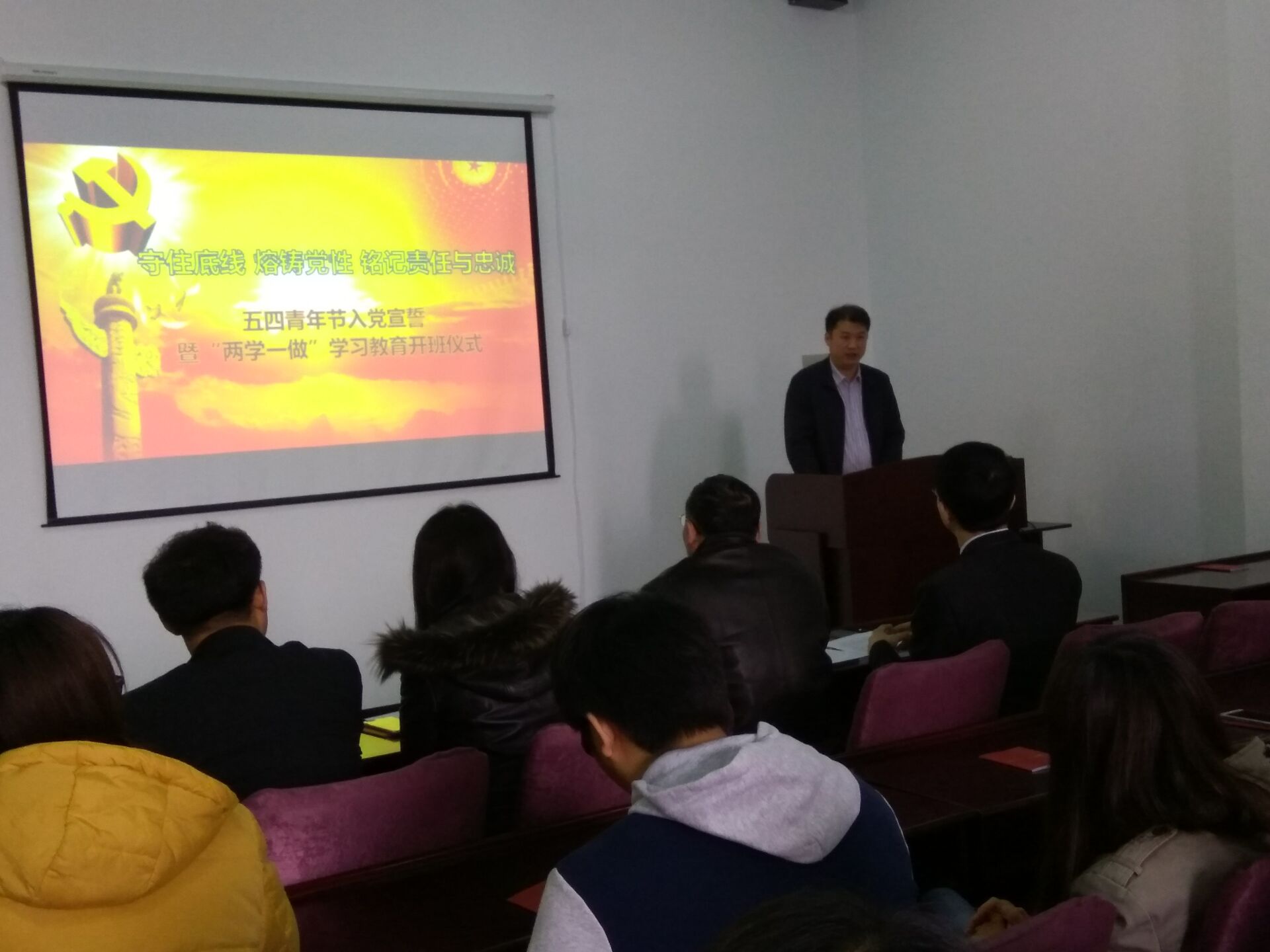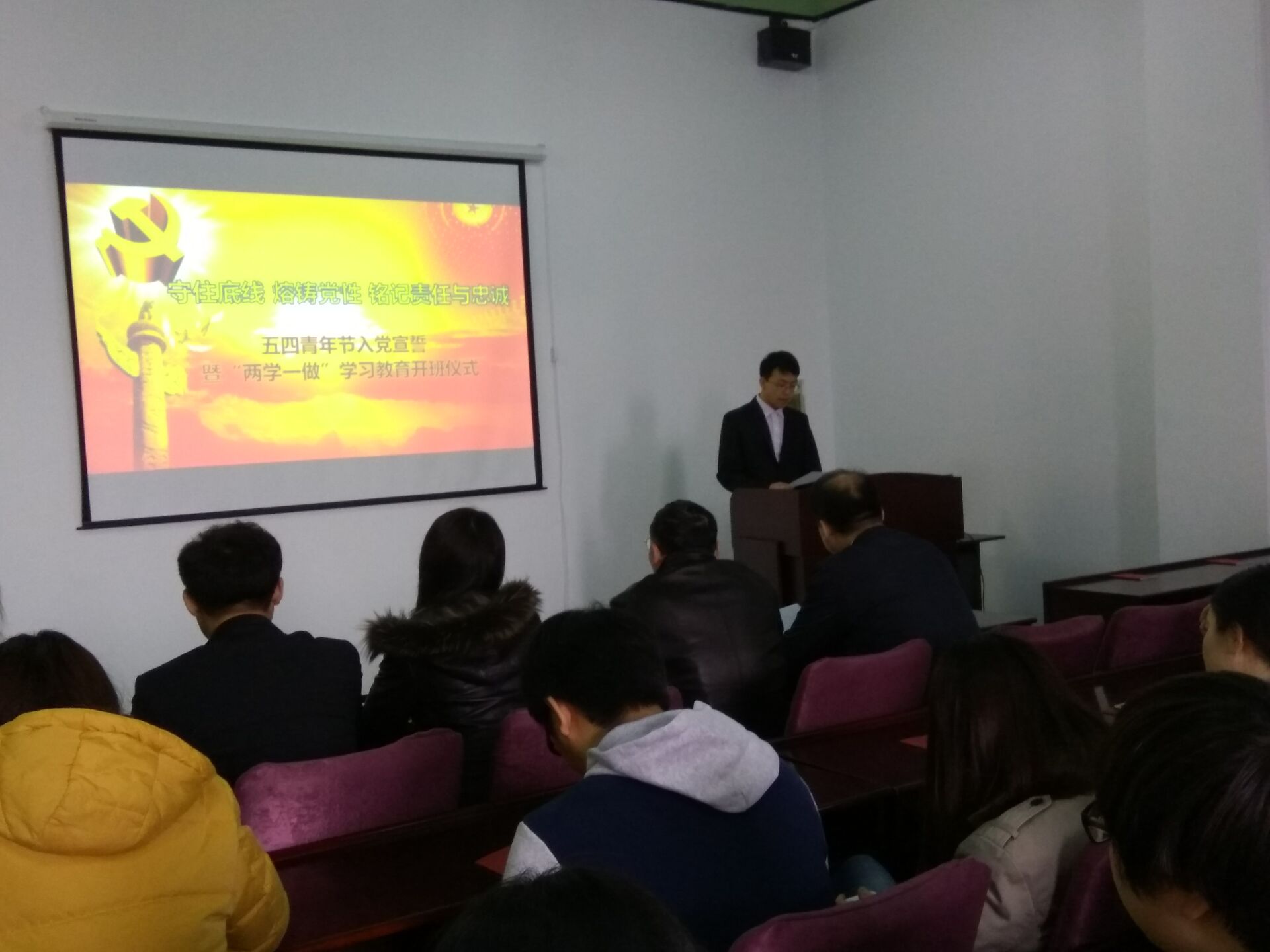 宣誓仪式在雄壮有力的国际歌中拉开序幕。首先,学院学生工作办公室主任王冕老师宣读了24名新发展党员名单。随后,在学生党员李昊阳同志的带领下,新党员集体上前宣誓,他们举起右拳,面对党旗,神情庄重地宣读了誓词,抒发了对党忠诚的决心。宣誓结束后,老党员又一一为新党员佩戴党徽并发放党章,祝贺他们光荣加入中国共产党。随后,预备党员代表赵成同学上前发言,他对党组织的深切关怀及各位党员同志的关心和帮助表示了深深的感谢,并表示将牢记入党誓词,勤奋工作、刻苦学习,时刻以党员标准严格要求自己,做一名合格的共产党员。最后,学院党委副书记兼副院长邱增凯老师讲话,他希望每一个党员终生都以这个神圣的时刻激励自我,践行入党誓言,为党的事业不懈奋斗。希望党员同志们以此次大会为新起点,更加严格要求自己,进一步学习党的基本理论和知识,增强党员的责任意识,在工作中勇挑重担,努力完成自己的本职工作,同时做到以下几点:第一,正确处理好个人利益与集体利益的矛盾,在工作、学习和社会活动中起模范带头作用。第二,按时向党组织汇报思想和工作情况,努力做一名合格的共产党员。与此同时,邱增凯老师也希望全体积极分子坚定信念,求取成绩,创造条件,通过实际行动向党组织靠拢,早日实现自己的人生追求。随后邱老师对学生党支部“两学一做”学习教育活动进行了具体安排部署。
