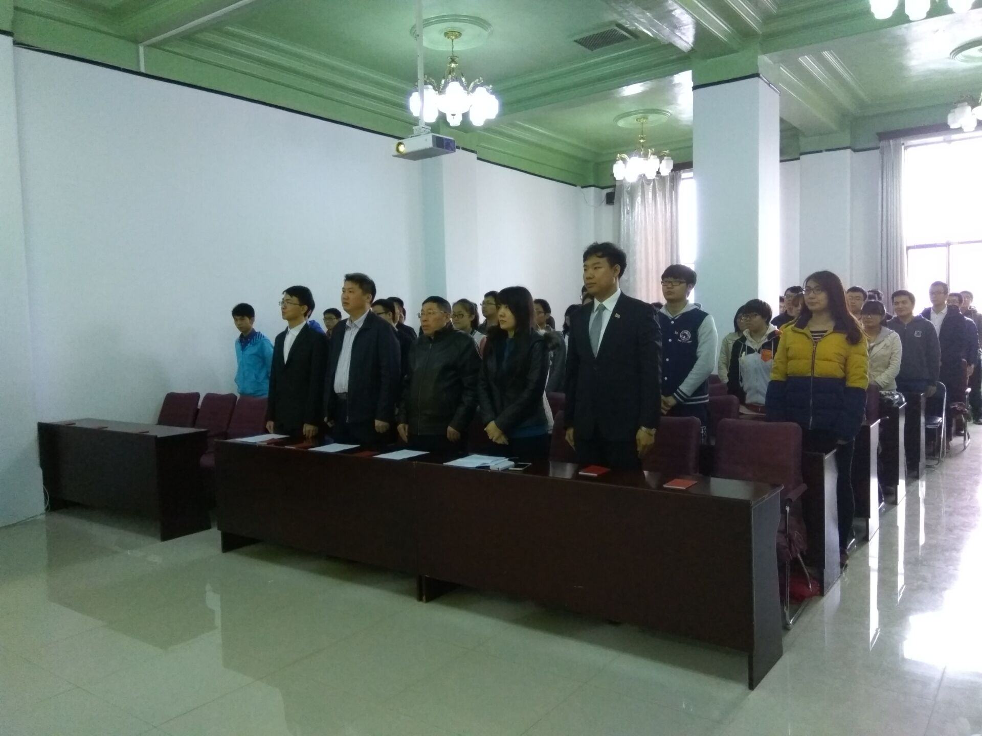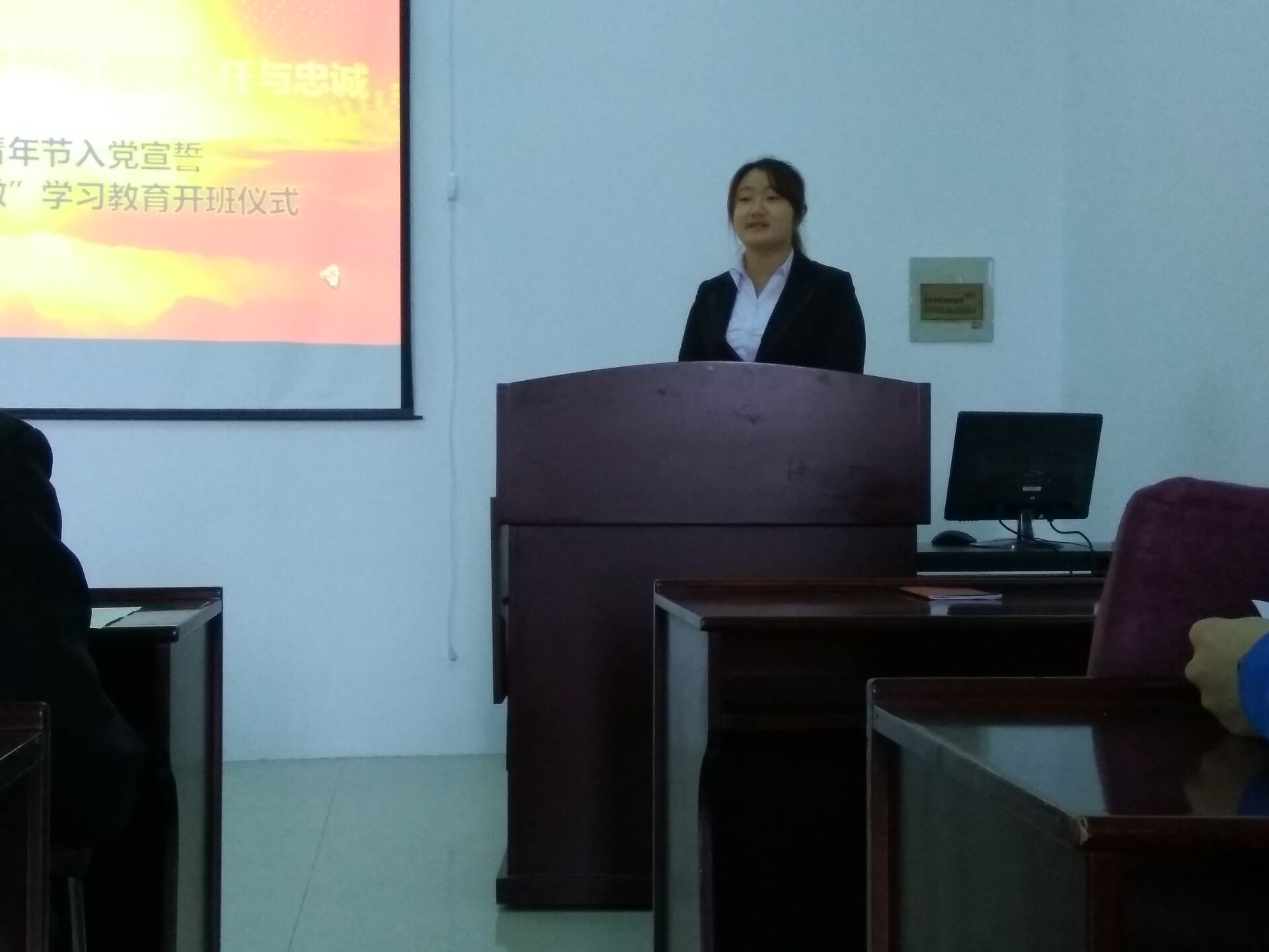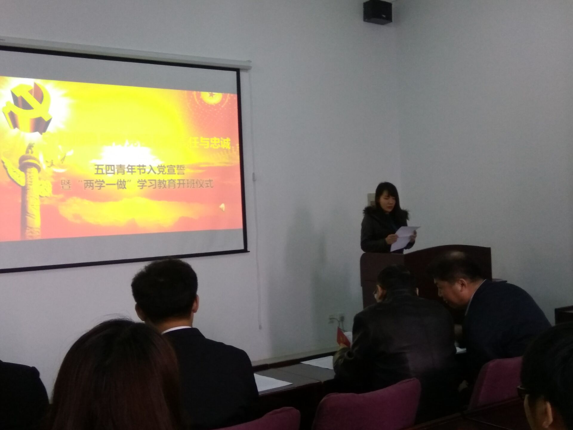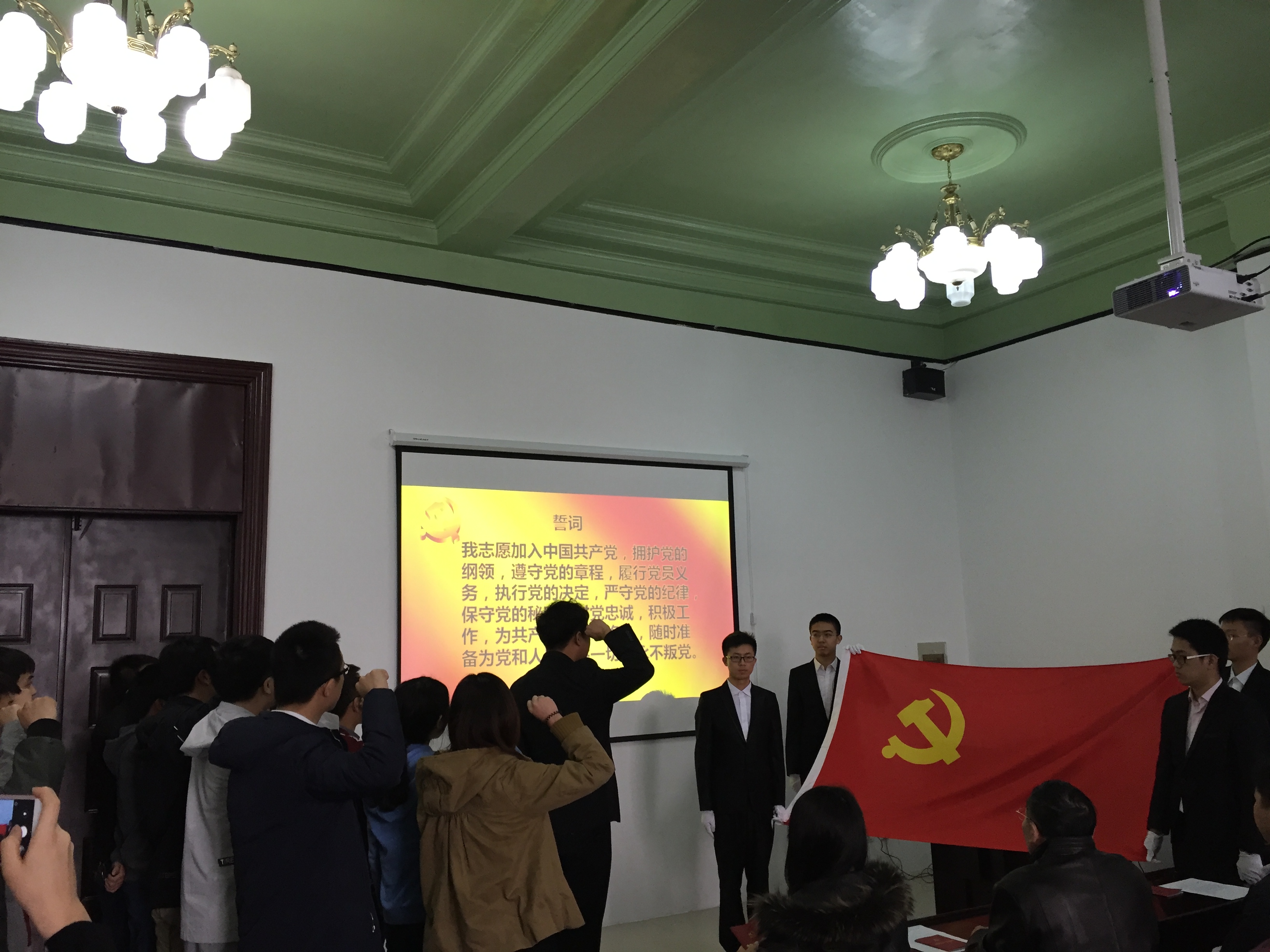 宣誓仪式在雄壮有力的国际歌中拉开序幕。首先,学院学生工作办公室主任王冕老师宣读了24名新发展党员名单。随后,在学生党员李昊阳同志的带领下,新党员集体上前宣誓,他们举起右拳,面对党旗,神情庄重地宣读了誓词,抒发了对党忠诚的决心。宣誓结束后,老党员又一一为新党员佩戴党徽并发放党章,祝贺他们光荣加入中国共产党。随后,预备党员代表赵成同学上前发言,他对党组织的深切关怀及各位党员同志的关心和帮助表示了深深的感谢,并表示将牢记入党誓词,勤奋工作、刻苦学习,时刻以党员标准严格要求自己,做一名合格的共产党员。最后,学院党委副书记兼副院长邱增凯老师讲话,他希望每一个党员终生都以这个神圣的时刻激励自我,践行入党誓言,为党的事业不懈奋斗。希望党员同志们以此次大会为新起点,更加严格要求自己,进一步学习党的基本理论和知识,增强党员的责任意识,在工作中勇挑重担,努力完成自己的本职工作,同时做到以下几点:第一,正确处理好个人利益与集体利益的矛盾,在工作、学习和社会活动中起模范带头作用。第二,按时向党组织汇报思想和工作情况,努力做一名合格的共产党员。与此同时,邱增凯老师也希望全体积极分子坚定信念,求取成绩,创造条件,通过实际行动向党组织靠拢,早日实现自己的人生追求。随后邱老师对学生党支部“两学一做”学习教育活动进行了具体安排部署。