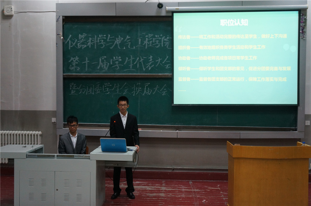 大会在轩昂壮阔的中国共产主义青年团团歌声中拉开序幕。此次大会首先审议并通过了第十届学生会主席李昊阳同学代表分团委、学生会进行的工作报告,回顾了一年来第十届分团委学生会的工作历程。对这一年来取得的成绩予以展示,同时深刻反思并陈述各方面工作的不足。随后,院团委书记兼2012级辅导员蔡印老师为第十届团学组织主要学生干部颁发了任职证书。证书颁发仪式结束后,学院第十届分团委副书记付博同学宣读了第十一届团学组织主要学生干部候选人名单,随后候选人依次上台演讲竞职。候选人们结合演示文稿陈述了自己的竞选理由和个人优势、组织和岗位认识以及任职后的工作构想,精炼而自信的演讲赢得了与会人员的阵阵掌声与赞叹。演讲完毕后各学生代表依次上台公开投票,民主选举产生新一届主要学生干部。最终,2013级于一兵同学当选第十一届分团委第一副书记,岳良广同学当选学生会主席,穆怀志、侯雪征、任晓闯当选分团委副书记,樊毅尧当选学生会副主席,大会还选举产生了分团委、学生会各部门负责人及科技协会、“牵手”青年志愿者协会、新闻通讯社等学生组织相关负责人。随后,2014级何宗泽同学宣读了倡议书,倡议团学组织的学生干部们认真工作,兢兢业业为同学们服务,为污污漫画