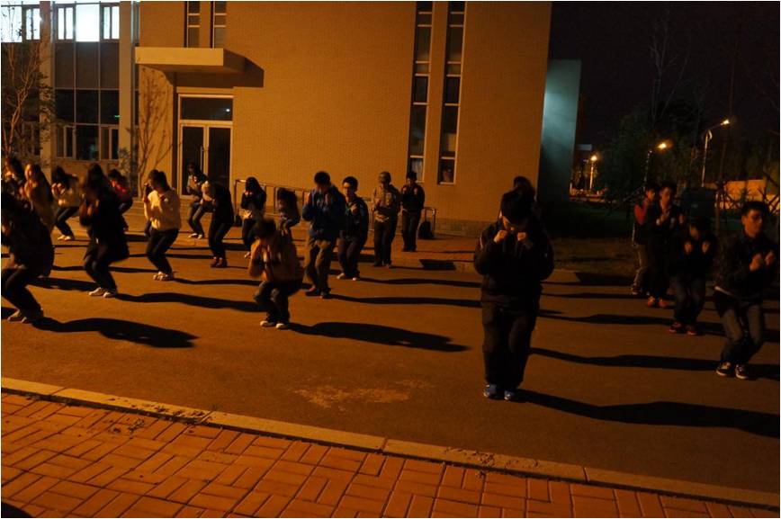 广播体操团队队员在院学生会负责人的组织下集中开展了赛前训练工作。