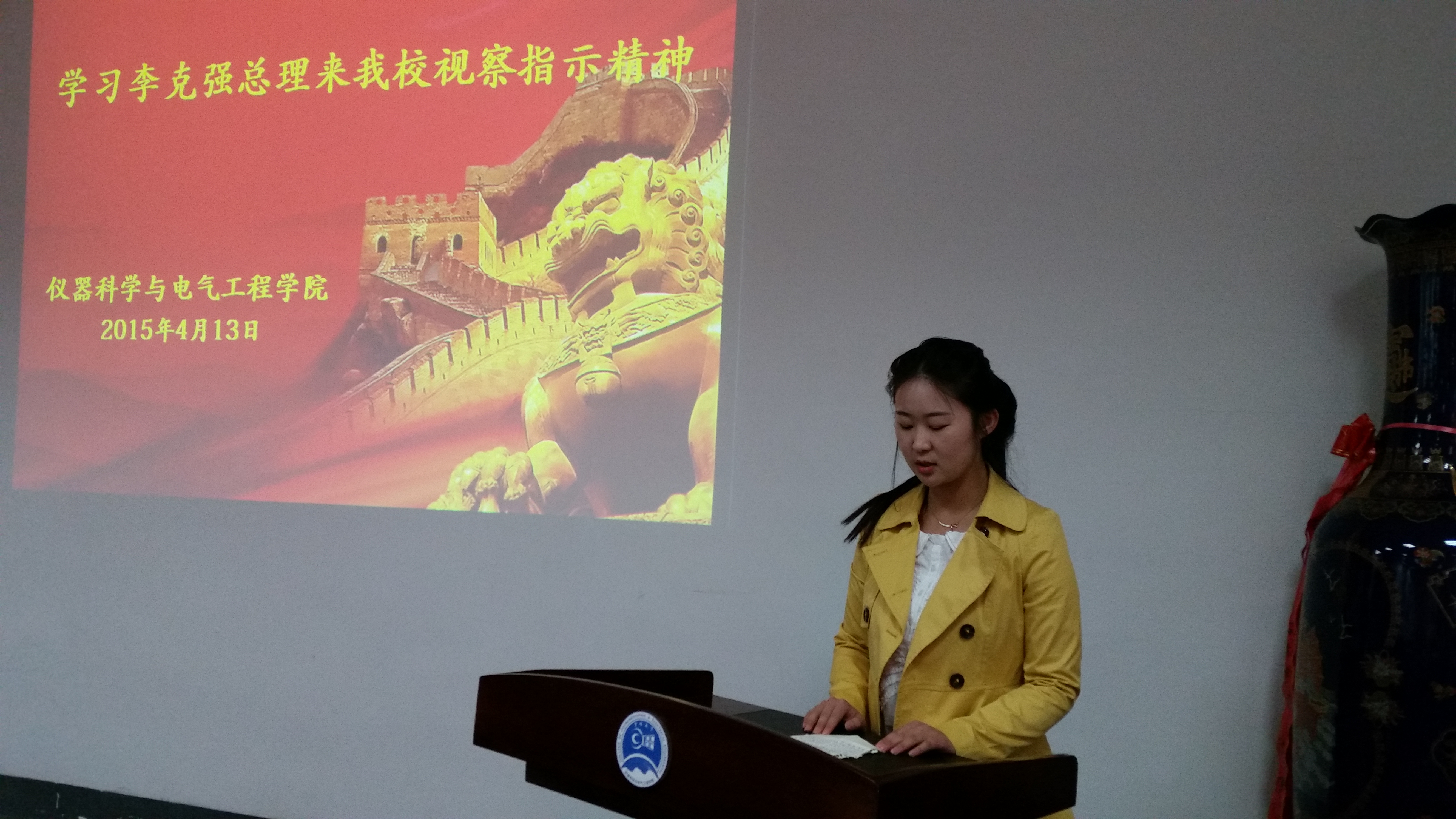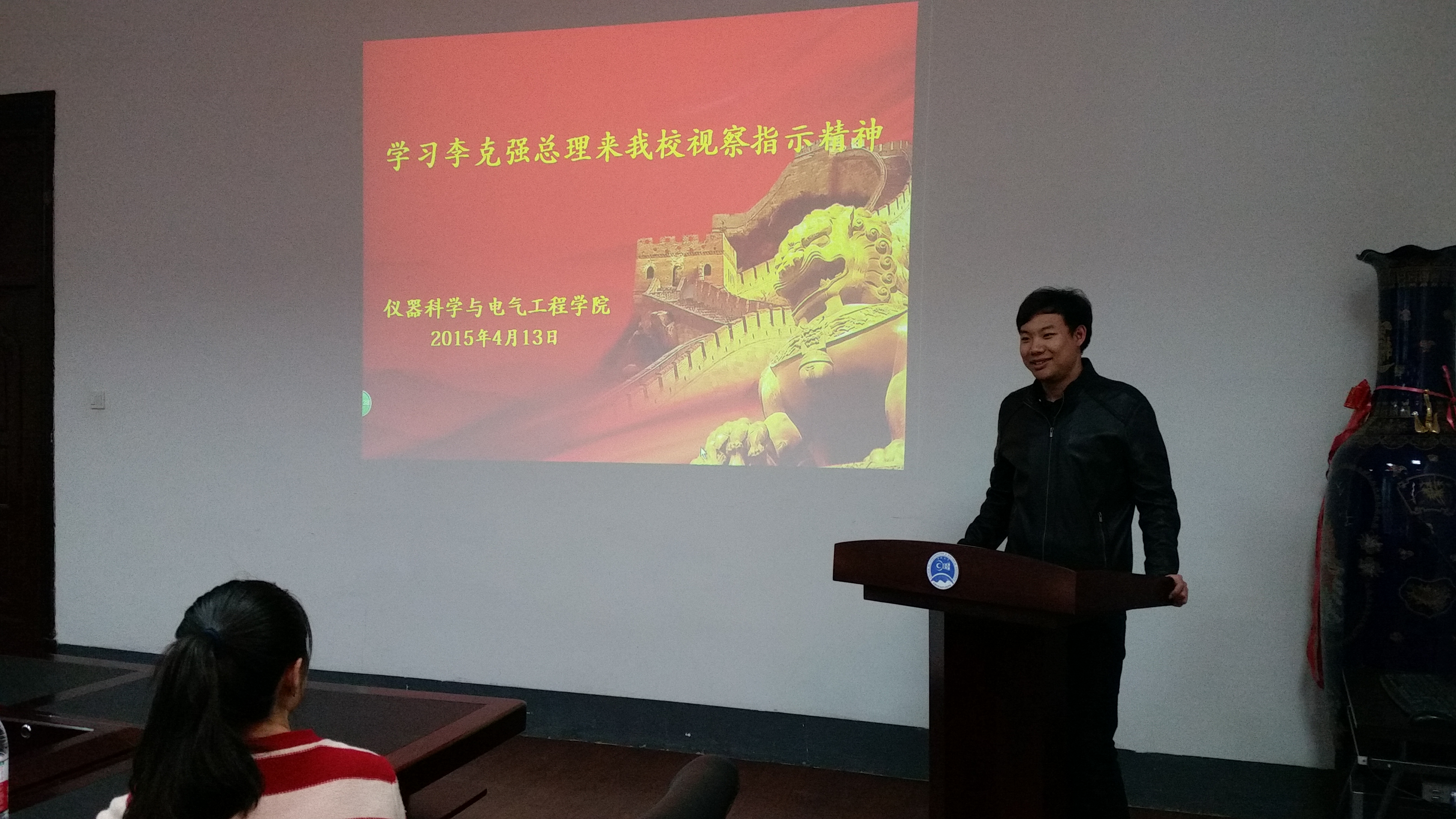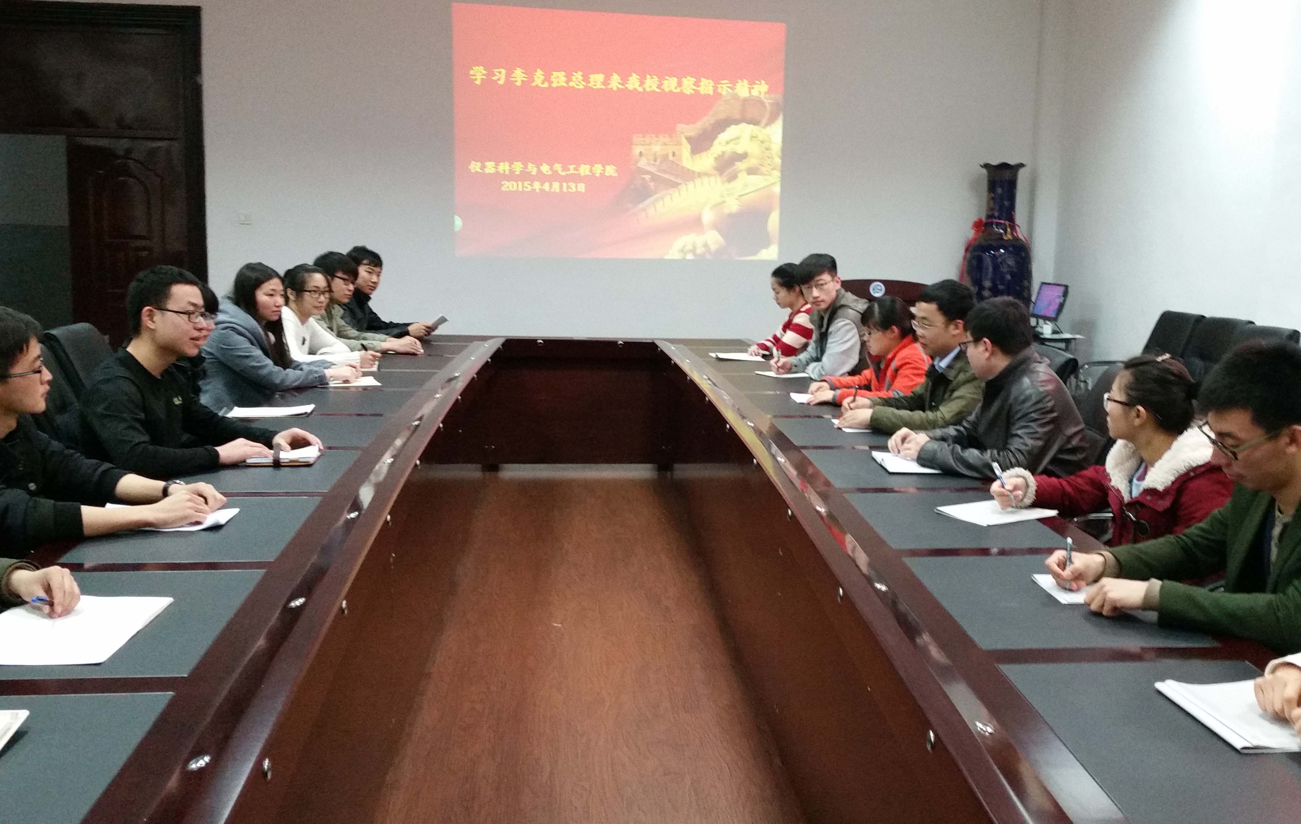 分团委副书记付博同学、学生会主席李昊阳同学、志愿者代表陈雨薇同学分别就总理来我校视察指示精神进行了传达。之后,有幸与总理近距离接触,亲身感受总理个人风采的2011级651103班史可同学向大家分享了她与总理接触时的场景与心得体会,通过史可同学的讲述,大家感受到了李克强总理的体贴与平易近人,体会到了总理对大学生就业创业的关心,领会到了总理与广大人民深深的鱼水情。