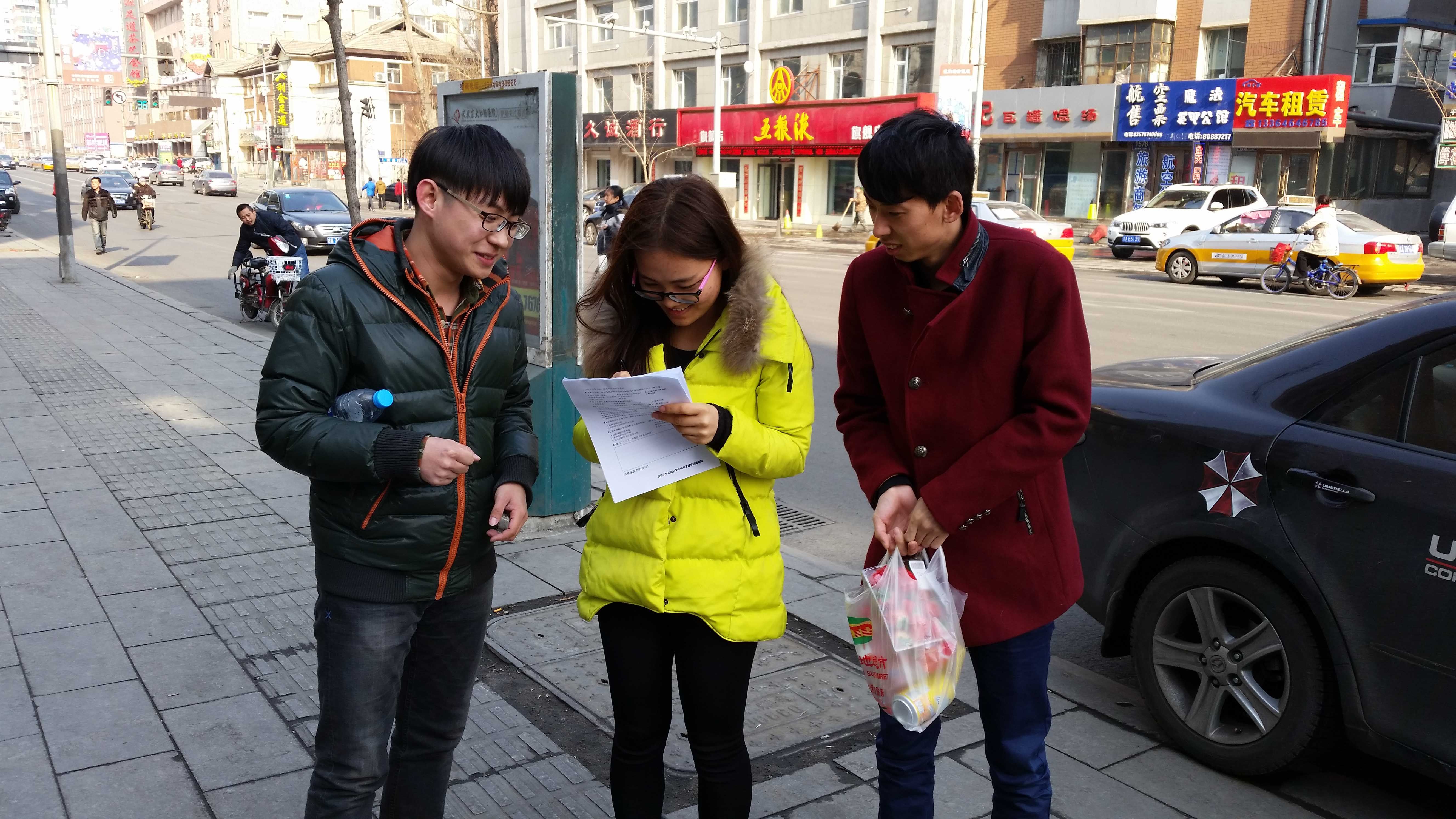 大学生社会实践调研团主要成员于2015年1月25日至27日携带调查问卷数百份,奔赴调研地,先后在长春、九台等地区进行了关于“建言献策‘十三五’”问卷调研活动。虽是严冬酷寒天气,成员们依旧满怀热情,奔走在各个社区、公园以及车站等场所,对基层居民开展了问卷调查。实践团成员热情耐心地向被调查人员说明调查目的,在征得同意后协助他们认真完成调查问卷相关内容并选取有代表性的人员进行简短访问。由于此次调研涉及多个地点,成员们为了提高效率,节约时间,实践团成员分成多个小组奔赴各地。无论是身上的疲惫还是恶劣的天气都没有浇灭同学们的热情,面对每一个调研对象,仍旧充满感激与虔诚。最终,团队圆满完成任务,发放调查问卷350份,回收348份,其中有效问卷达340份。