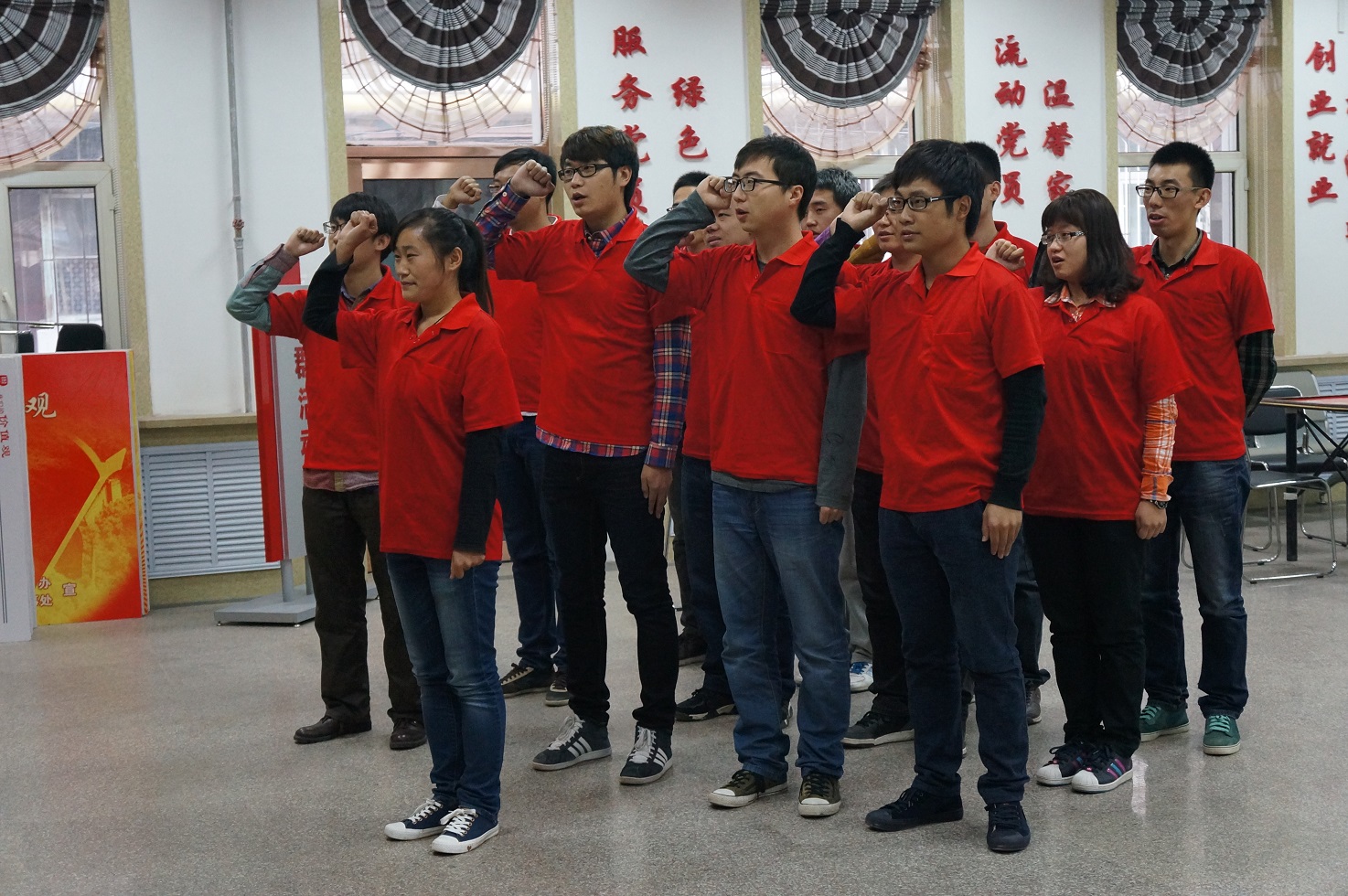 学院本科生党支部全体党员、入党积极分子及6名新发展的党员参加了此次仪式,仪式由本科生党支部副书记张昊宇主持。伴随着雄壮的《中华人民共和国国歌》,仪式正式开始。首先,党支部副书记张昊宇宣布了参加宣誓的预备党员名单。随后,2011级学生党员、“十佳大学生”候选人王顺月同学带领全体党员面向党旗庄严宣誓。最后,院团委书记兼本科生党支部书记朱宇老师讲话,他希望大家严格要求自己,增强党员的责任意识,在工作中勇挑重担,正确处理好个人利益与集体利益的矛盾,在学习、工作和社会活动中起到先锋模范带头作用;希望大家积极进取、乐于奉献,以良好的精神状态、充足的干劲为学院的建设发展努力奋斗,以自己的不懈付出及取得的优异成绩向党组织交上一份满意的答卷。伴随着慷慨激昂的《国际歌》,入党宣誓仪式圆满结束。