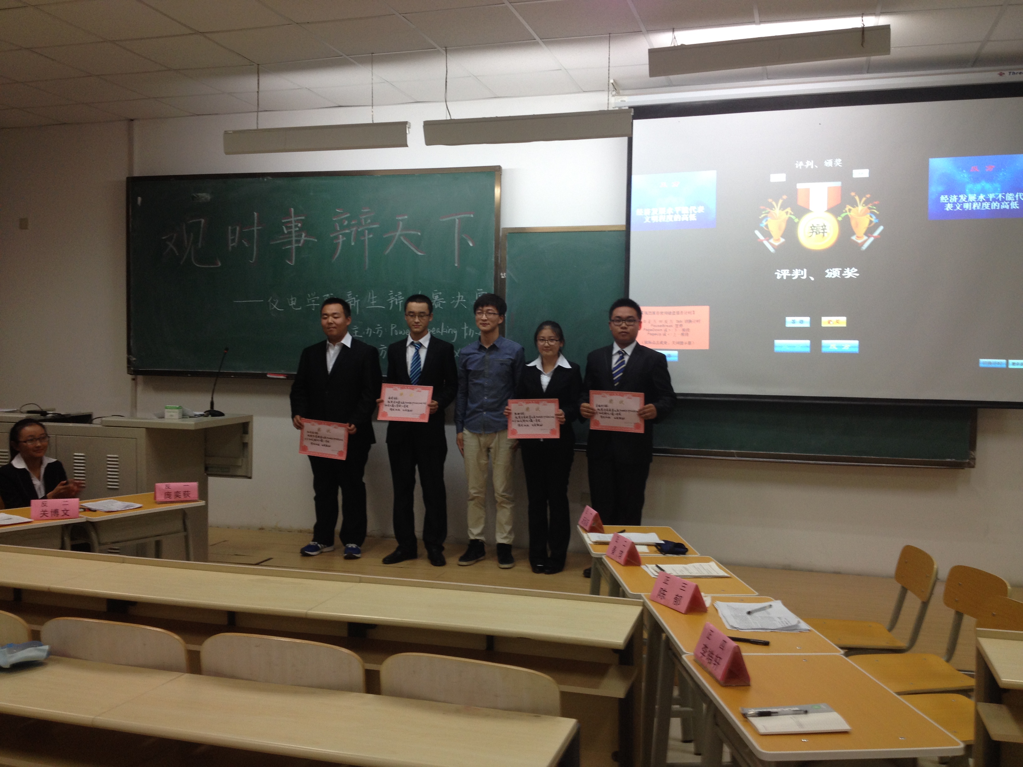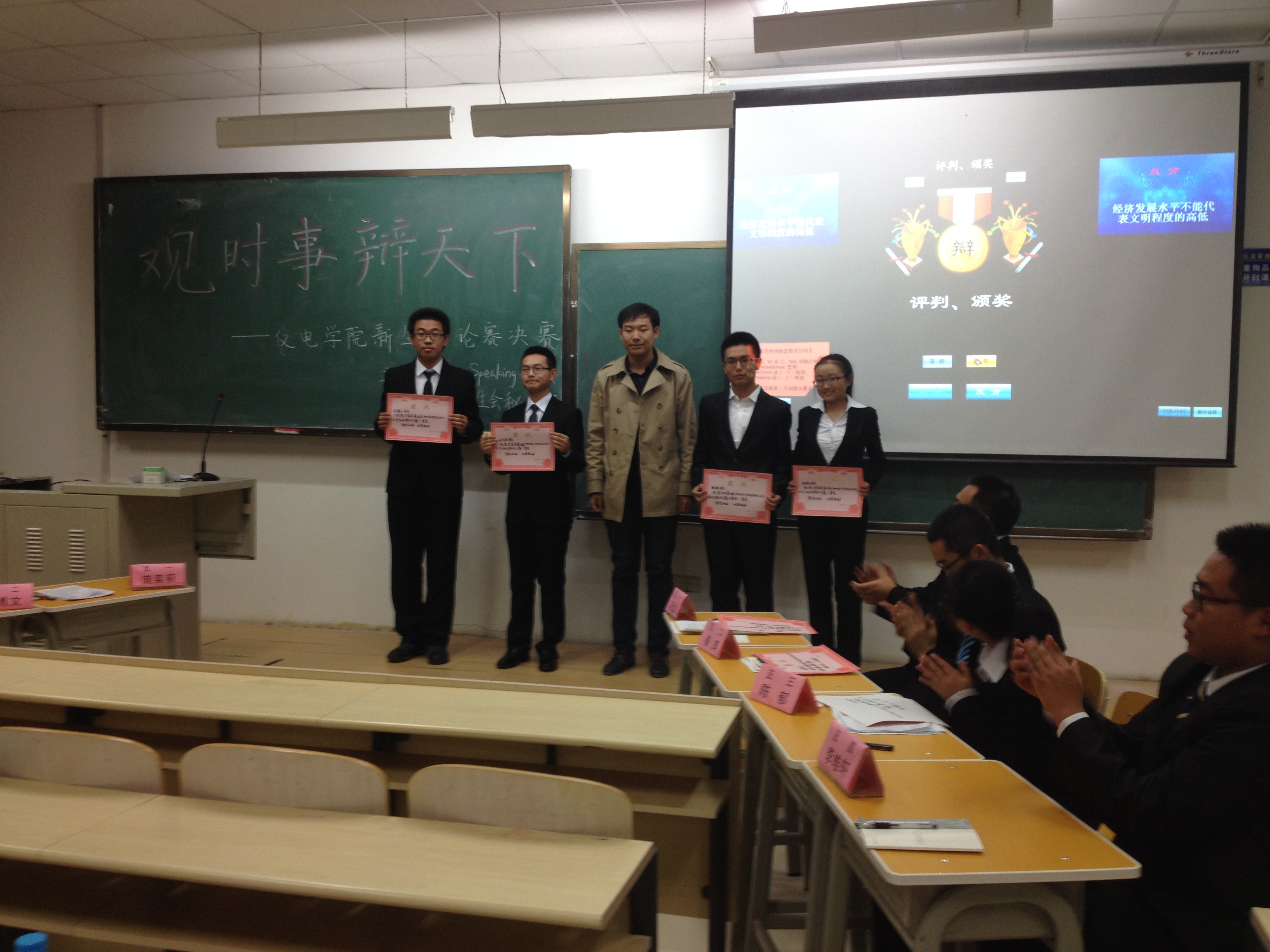 团委主办、学院学生会秘书部和Power Speaking口才协会共同承办的2014级新生辩论赛决赛于2014年10月29日在中心校区李四光楼成功举行。