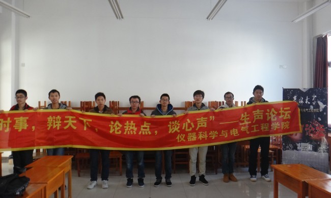 团委组织策划了“生声论坛”系列活动。2013年12月19日,第六期“生声论坛”活动以“我眼中的大学,论期末学习与考试”为主题在中心校区李四光楼214室举行,参加本期论坛的有2013级各班级班长、团支书以及2011级、2012级优秀学生代表。