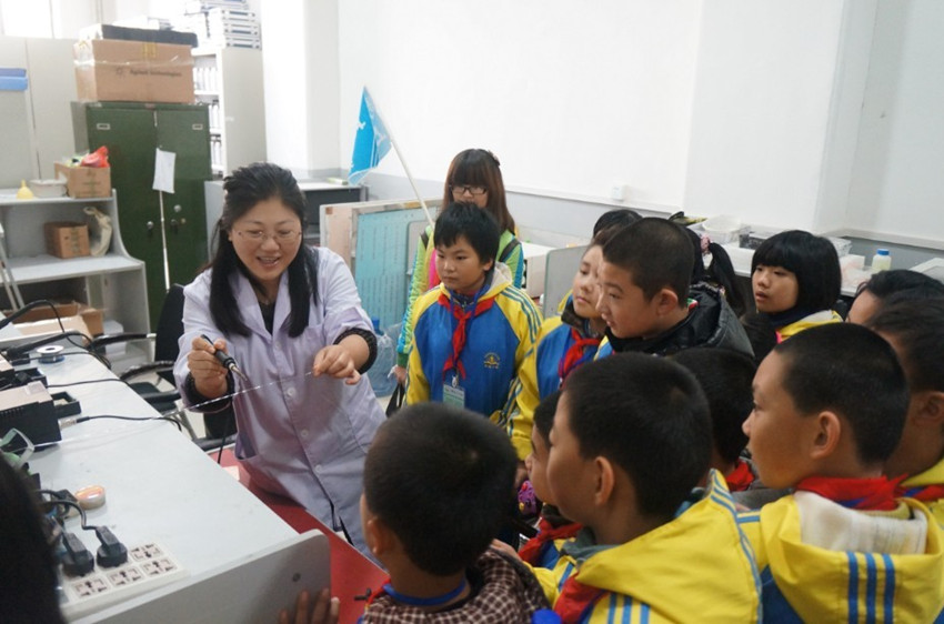 大学生科技创新开放实验室,实验中心千承辉老师在这里热情地接待了这些孩子们,带领他们参观了各式各样的实验仪器,并亲自为大家进行演示,同学们认真聆听、跃跃欲试,从孩子们清澈明亮的眼睛里我们看到了他们对科学知识的渴求和对大学生活的向往。