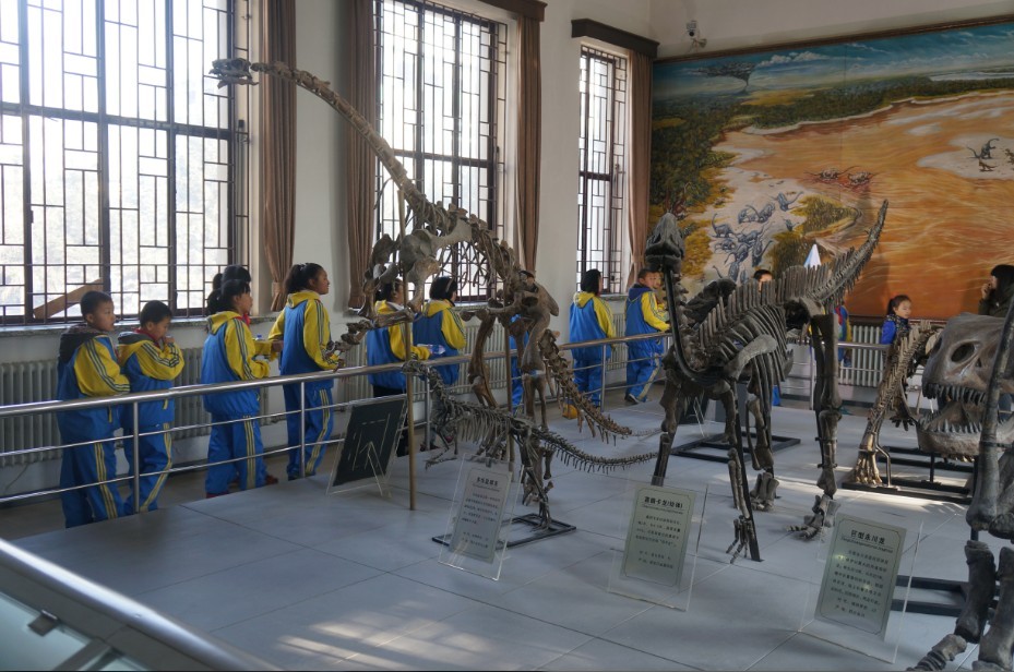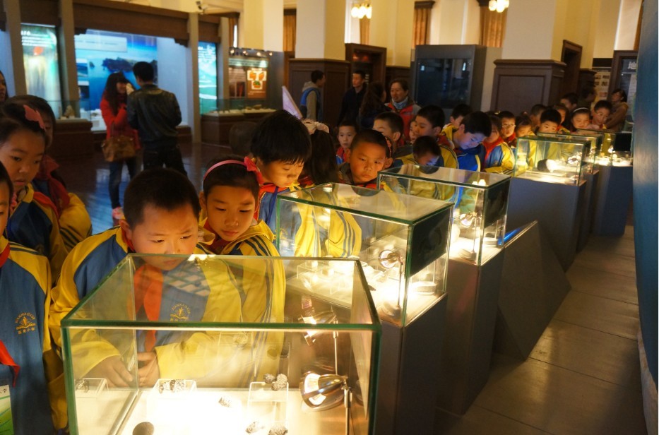 志愿者的带领下地质宫博物馆进行参观。博物馆分科普厅和恐龙厅,科普厅设有奇石展区、宝玉石展区、古生物展区及地学科普知识展区,这里有丰富多彩的天然宝玉石原料及加工制成的半成品,这些宝玉石美观、耐久、稀少,同学们一边感叹大自然的鬼斧神工,一边惊讶地质世界的丰富多彩。恐龙厅展有多具巨型恐龙骨架化石及珍贵的恐龙蛋、恐龙脚印化石等,孩子们看到远古恐龙巨大的化石不仅惊叹连连,仿佛置身于奇幻的恐龙世界。参观后,孩子们纷纷表示此次参观让他们受益匪浅。