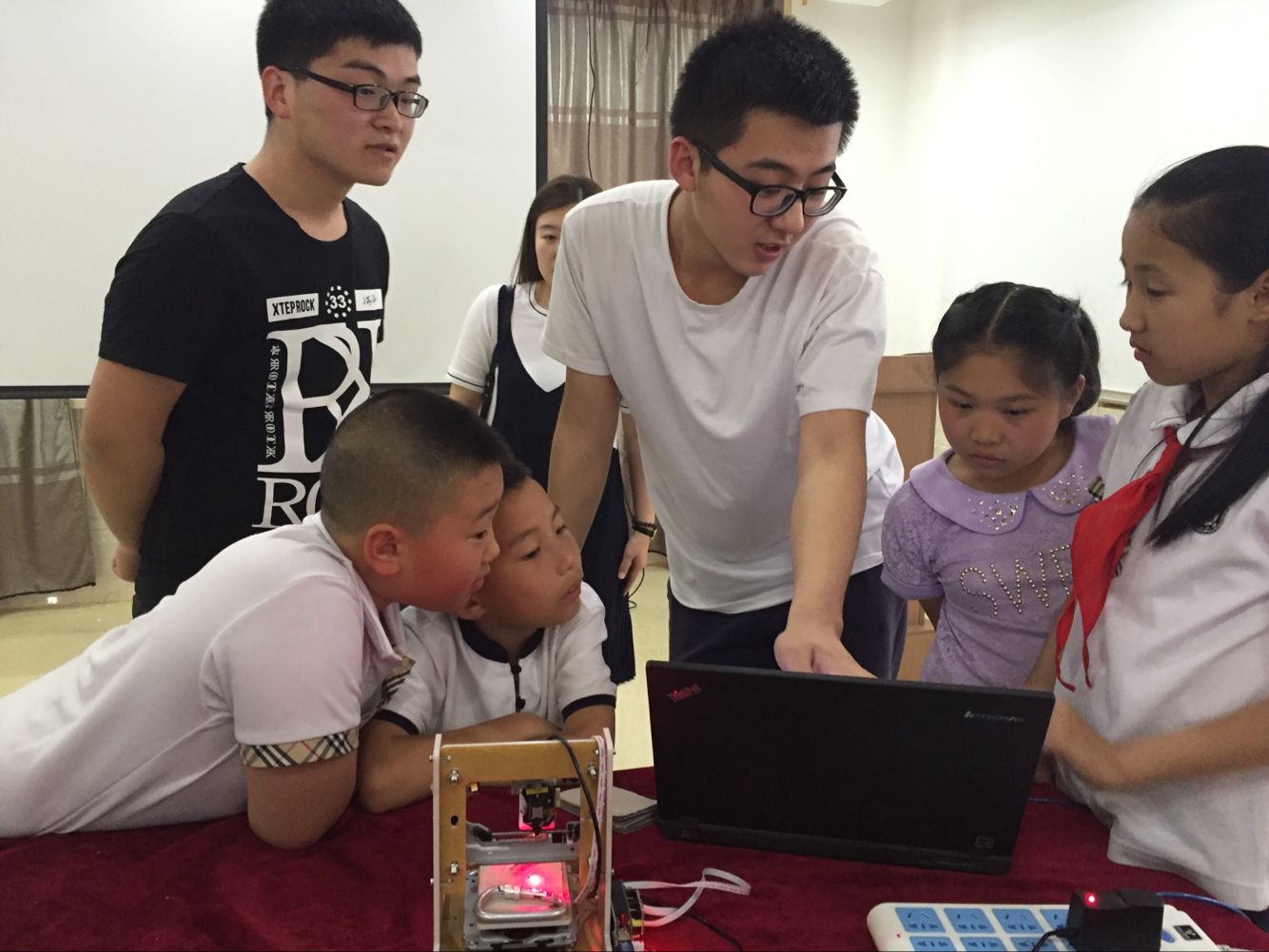 4月24日至5月24日,在活动的校园准备期间,负责人袁锦烽悉心督促22组志愿者自主完成电子产品的设计;5月25日晚6点,由大学生科技创新协会会长李冰洋组织进行优秀作品的评分筛选,志愿者们热情高涨的展示介绍自己的电子作品。5月27日,为了喜迎六一儿童节的到来,志愿者们走进西朝阳社区,与孩子们互动,向孩子们讲解科技作品原理。垂直led旋转屏趣味性强,与孩子们产生了良好的互动,大家纷纷写下自己的名字并通过旋转的屏幕展示出来;激光竖琴让有音乐天赋的孩子大显身手,动听悦耳的琴声在空气中洋溢着,小孩子们情不自禁地鼓起了掌,家长也点头称赞;六足避障机器人也让孩子们动起手来,每成功避开一个障碍物,孩子就发出兴奋的笑声,热闹非凡。与此同时,负责人也与社区书记和家长们进行了愉快的交流。