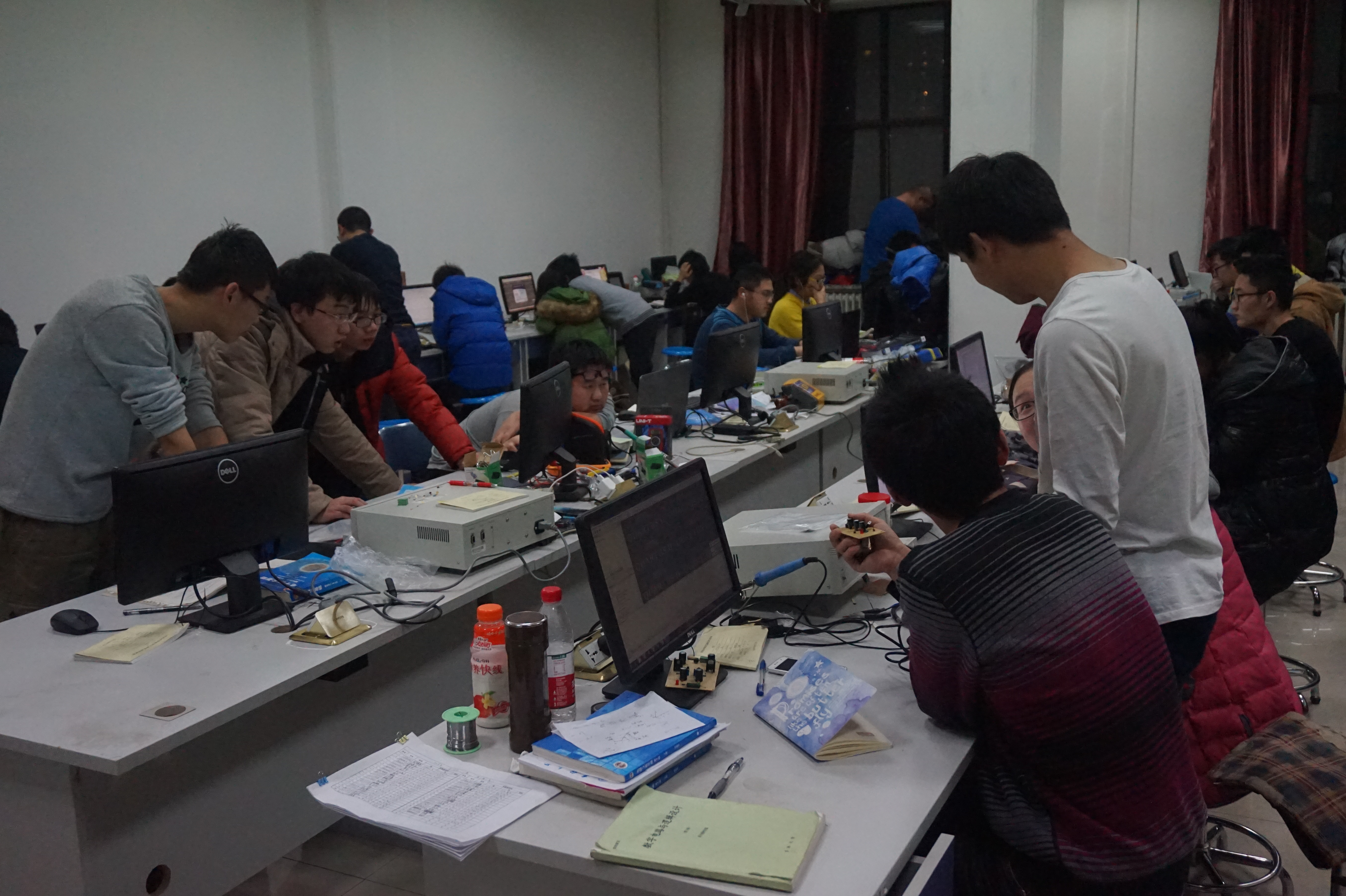 上午8:00-11:00与地质宫216元器件库及408教室,2014级队员以一帮二的形式为2015级队员讲解无源器件的认知。下午13:30-16:00于地质宫224教室,李春生老师为2013级,2014级,2015级队员讲解了LC滤波器的设计与制作2。 李老师首先带领大家复习了LC谐振的主要内容和相关知识点。然后,李老师就阻抗转换电路,LC滤波器的选择,引线电感、分布电容的影响进行讲解。紧接着,李老师向再做的同学提出了两个问题:1、为什么要实现阻抗变换?2、为什么常用的同轴电缆的阻抗是50欧姆和75欧姆?接下来的整个课堂都围绕着这两个问题展开。李老师用课堂讨论的方式跟同学们讲解了上面提出的两大问题。晚上18:00-20:00于地质宫224教室,万云霞老师为2013级,2014级队员讲解了MATLAB数据拟合与误差消除。万老师首先介绍了数据拟合与误差消除的重要性,随后她通过电阻阻值与温度的关系这一案例向同学们介绍了最小二乘法,遗传算法等。万老师还带着大家操作了一个数据拟合的案例。最后她向同学阐述了几种误差消除的方法,并建议队员们回去多加练习。