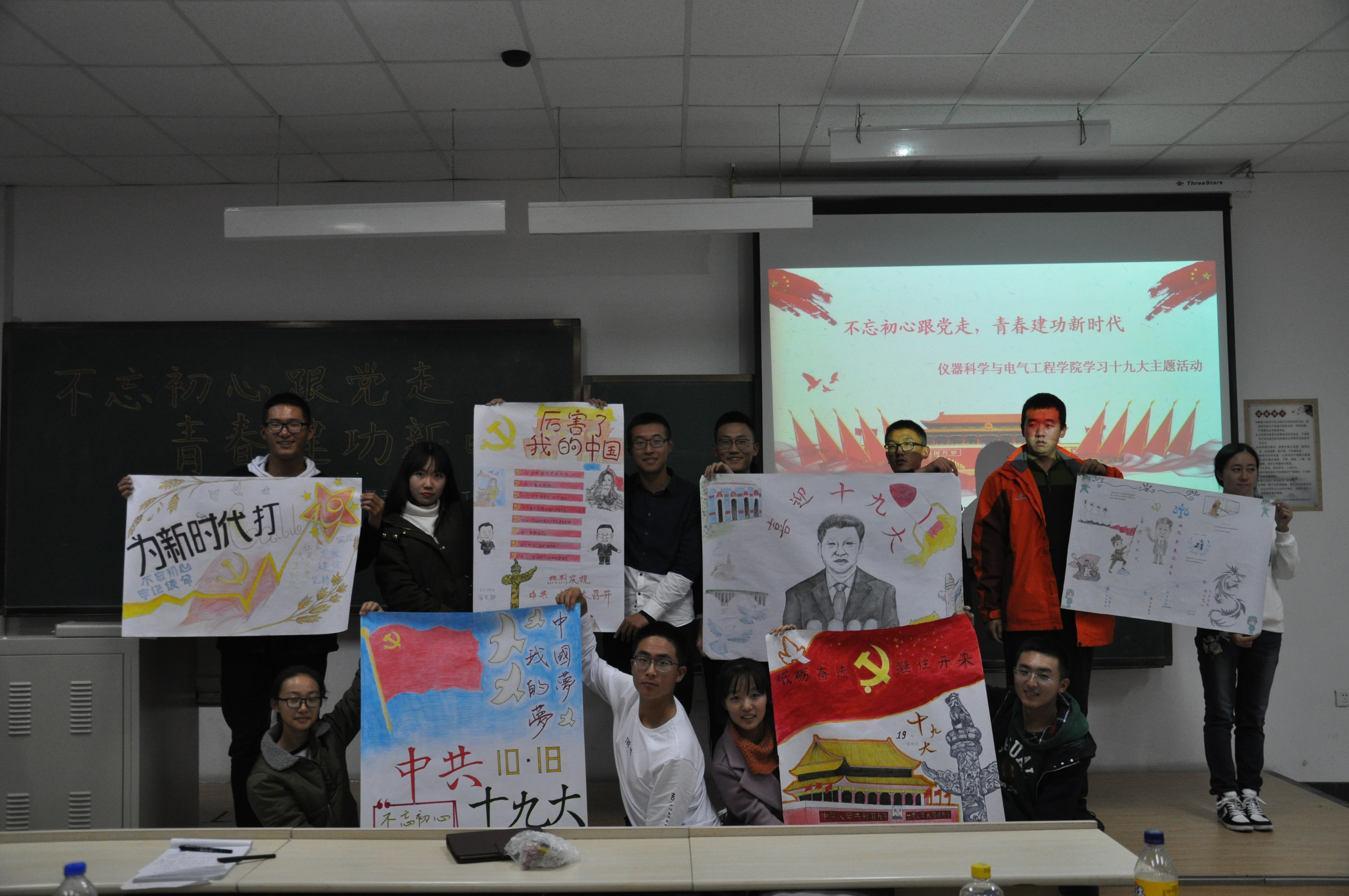 的大学生经过积极认真的理论学习思考,把对党和国家的崇高敬意,对青年使命的深刻理解,对祖国未来的美好期望进行生动地艺术表达,创新性地设计了十九大手绘学习宣传海报。活动一开始,各团支部学生代表生动细致地讲解了海报创作过程与设计理念,各图像元素的精心安排和深刻寓意均体现了学生们的良苦用心以及对党和国家的热爱。