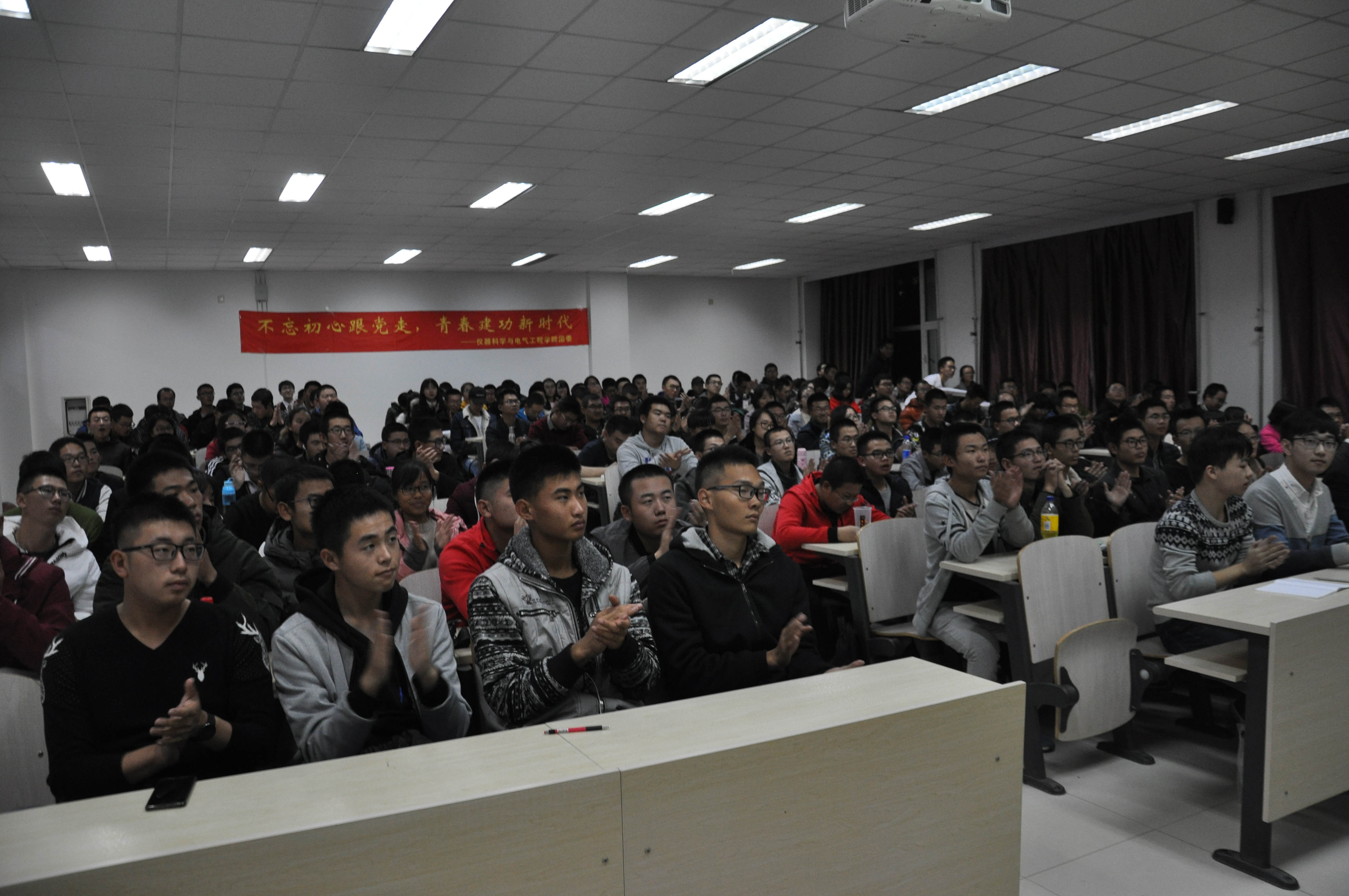 然后,主持人为同学们依次播放了新华网为迎接十九大制作的纪录片《领航》以及习近平同志在十九大报告中讲话的节选片段,同学们认真观看,不时颔首,倍感振奋。视频播放结束后,现场掌声雷动,不绝于耳,他们是在为日益强盛的祖国感到自豪,为能够处在这样一个伟大的新时代感到骄傲。