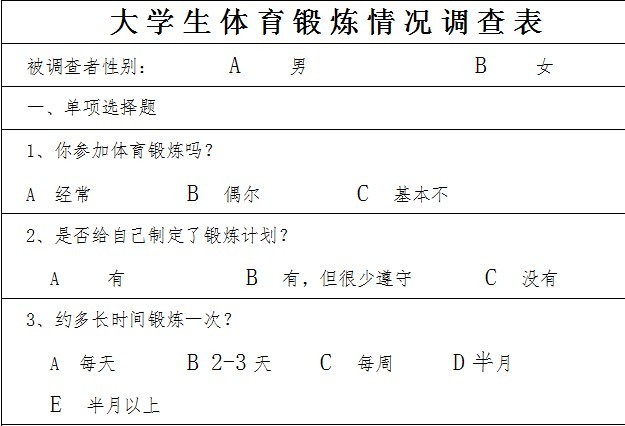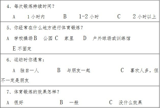 从调查结果可以看出,普遍受欢迎的体育项目是篮球、足球、羽毛球和跑步。但是大部分同学没有自己的体育锻炼计划,很多都只是随机安排自己的体育锻炼活动。对于参加体育活动的目的,同学们认为主要在于增强体质,同时也有为了缓解压力和减肥等。从这次征集活动中,我们还了解到在体育锻炼方面,女生的参与度相对落后于男生,建议广大青年女同学在未来的大学生活里积极参加课外活动和体育锻炼,增强体质。