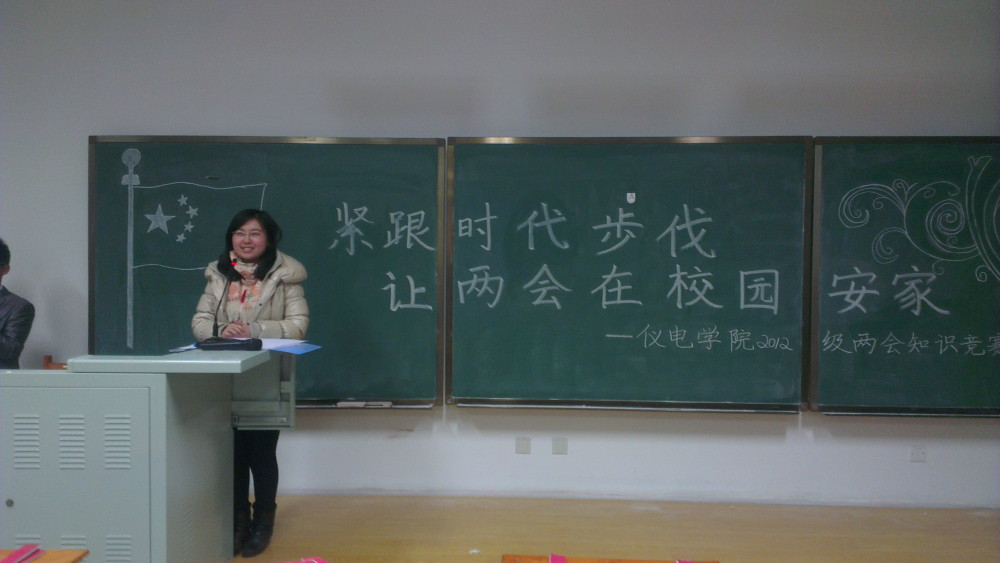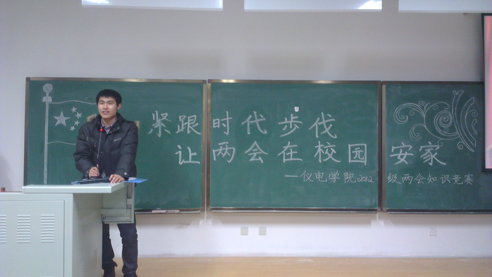 于2013年3月21日18:30时在中心校区李四光楼208室隆重举办了主题为“紧跟时代步伐,让两会在校园安家”的两会知识竞赛活动。此次两会知识竞赛由仪电学院分团委学生会主办,学生会生活部承办,并受到了吉大电视台的关注报道。第八届分团委副书记李娇阳、学生会主席朴冠宇、院学生会常务副主席任广安、学生会副主席王洪超以及学生会学生干部出席了活动,2012级全体同学参加了活动。