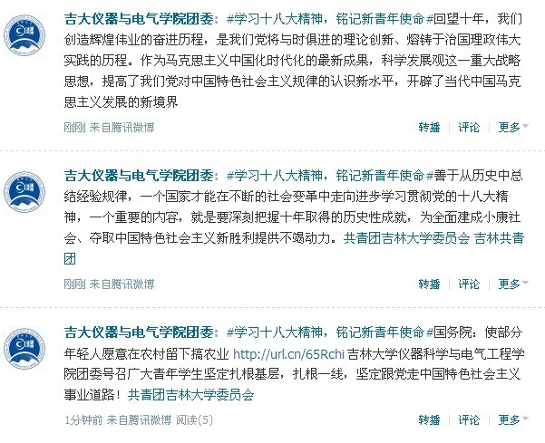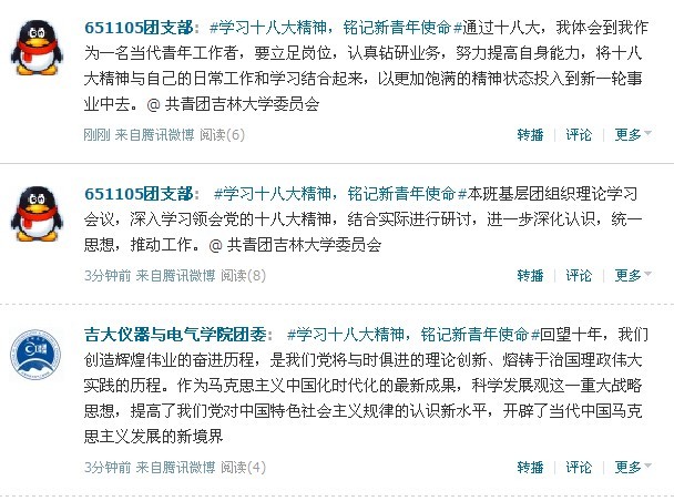 学院团委号召各班级团支部要高度重视并把学习宣传贯彻党的十八大精神作为当前和今后一个时期的首要政治任务,把这项工作摆在突出位置,集中力量,抓好落实,大力创新活动形式和载体,力求贴近学生的思维方式和认知习惯,不断积极创新总结,扎实推进微博学议十八大活动,不断掀起学习宣传贯彻十八大精神的新高潮!