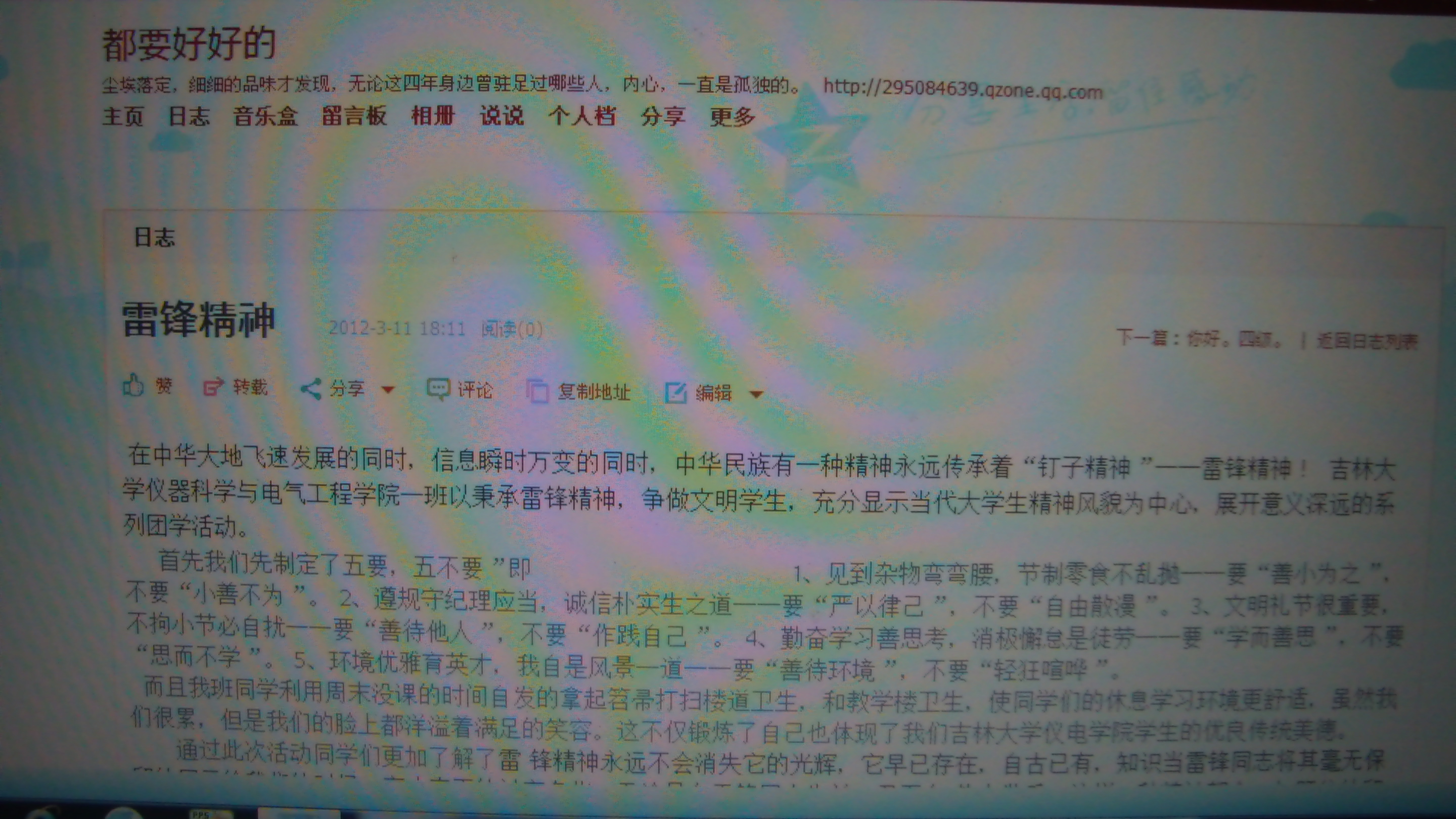 3月11日晚,2011级一班班委在QQ空间、人人网等新媒体上发表了学习雷锋精神的有关文章,班级同学积极参与转发,希望感染身边更多的人学习雷锋,继承雷锋同志的奉献精神,参与到学习雷锋活动中,努力承担起对学校、对社会的责任和义务。