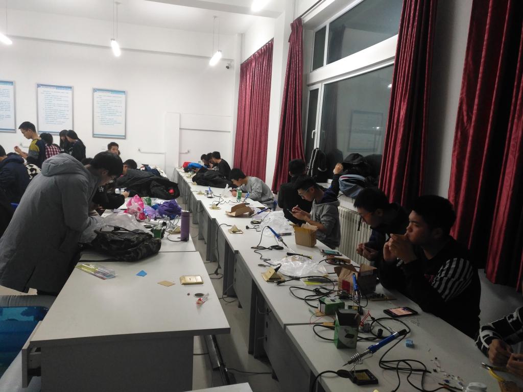 首先负责人对本次培训的内容做了简要陈述并对呼吸灯电路做了详细的剖析。为了本次培训,负责人们做足了准备。新生们更是学习热情高涨,提前做好了预习工作,有的甚至提前完成了焊接,但仍然全神贯注的听着学长们讲解。紧接着讲解一结束,新生们便紧锣密鼓的进入“工作”状态,开始在电路板上进行布局、走线,一时间大家的实践热情都调动了起来。负责人对新生们的焊接工作进行了全程指导,期间重点强调了新生在焊接过程中普遍存在的问题并做了详细的总结。新生们认真的把这些问题都记到了自己的笔记本上,充分体现了新生们积极的学习态度。最后,新生们拿着自己的作品等待检测,时不时还讨论着今天的培训内容,脸上洋溢着开心的笑容。