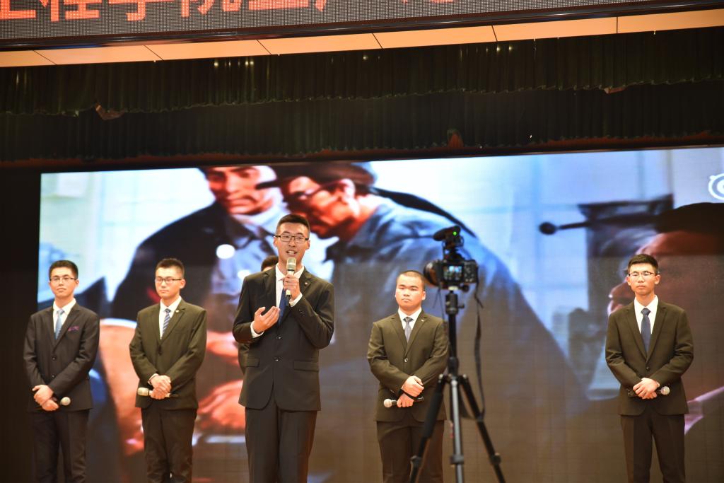 在此次汇报演出过程中六位社员用演讲脱口秀的方式进行了“不忘初心,回望十九大”专题演讲,表达了自己对十九大的看法与理解。演讲开始后,首先由主持人崔天成同学对十九大的背景进行了简要的介绍,2017级的陈宇峰与林晨希、郜泽霖与郭永甲、仲维一与刘熠三组同学分别选择了国防实力与教育、中国社会主要矛盾转变前后变化、“一带一路”外交发展三个话题、共六个方面向在场观众展现了十九大报告中所传达的成果与指导方针。演讲同学用风趣的语言和生动的比喻、事例向我们阐述了十九大的内容。现场同学们认真听取演讲并对中国在五年以来的发展与变革有了更深刻的认识。而演讲同学联系生活的部分更使同学们感同身受并多次爆发出热烈的掌声。随后,马克思主义学院副教授王成老师对整个活动进行了点评,对活动的举办表示肯定并对六位同学的表现给予了赞扬,最终由公共外语教育学院杨梅老师和Alex Cerola老师为演讲同学颁奖。
