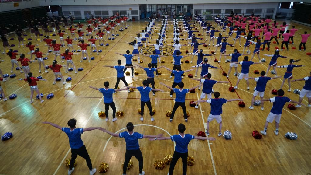 体操代表队在教练的带领下做着最后的动作练习。比赛开始,由主持人宣读了比赛评分标准并介绍了到场的各位领导和老师。随后,各体操代表队入场开始比赛。在广播体操轻松的音律中,同学们昂首挺胸,动作整齐划一。踏步,扩胸,伸展,跳跃,动作到位,绝不拖泥带水。在体操整理运动结束后,同学们立刻捡起花球,开始了啦啦操的表演。队员们的动作十分标准,整体井然有序,节拍与节奏掌握得恰到好处,充分展现出积极进取,乐观向上的精神风貌,赢得了评委老师的一致好评。展示结束后,队伍有序地退场,观看其他方队的展示。