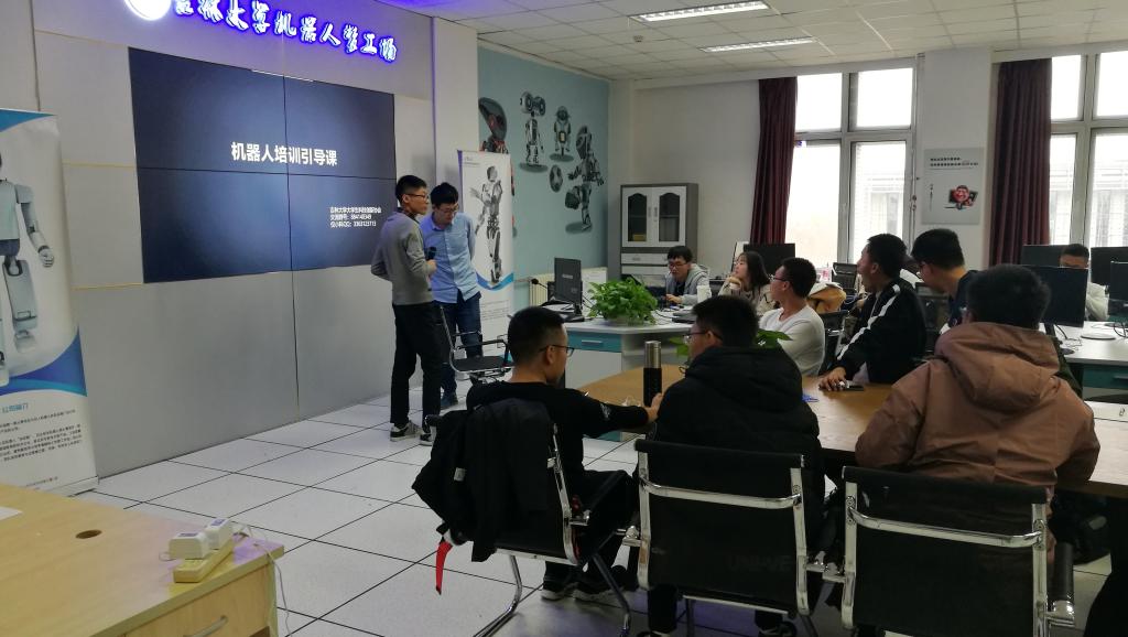 培训活动伴随着两台UBTECH机器人的开场舞正式开始。在简单介绍之后,滕泽远同学首先对武术擂台赛机器人设计目的和设计原理进行详细讲解,使同学们对比赛内容有了一定了解,接着带领同学们观看了小车对抗比赛的视频,激烈紧张的比赛让同学们对武术擂台赛机器人燃起浓厚兴趣,随后又带领同学们运用Luby Creater软件对机器人的代码进行设计,详细的讲解和现场操作引来同学们的阵阵掌声,将引导课的气氛推向高潮。高鑫宇同学接过话筒,首先风趣地讲解了人形机器人的结构,贴合人形机器人对抗赛的比赛规则,一一讲述了各个部件的作用以及比赛时的战略部署和调试技巧,接着对人形机器人各项赛事进行详细介绍,着重强调了比赛规则和得分方法,在比较容易出现疑问的部分,高鑫宇同学以视频介绍的方式带领同学们一起思考,加深了大家对比赛的理解,使同学们收获匪浅。随后惠乾鑫同学走上讲台进行总结,提出幽默诙谐的问题与大家进行交流,大家各抒己见,通过交流,他对同学们的想法表示强烈支持,并且依据自己多年的比赛经历,向同学们提供很多珍贵的实战经验,同学们对他的耐心指导也都谨记在心,另一方面他着重强调了比赛时的心态,良好的心态决定着比赛时的正常发挥,而且要拒绝畏难情绪,出现问题就要去解决问题,结果的好坏并不重要,重要的是在比赛中学到经验和知识,同样的问题下次遇到便迎刃而解了。
