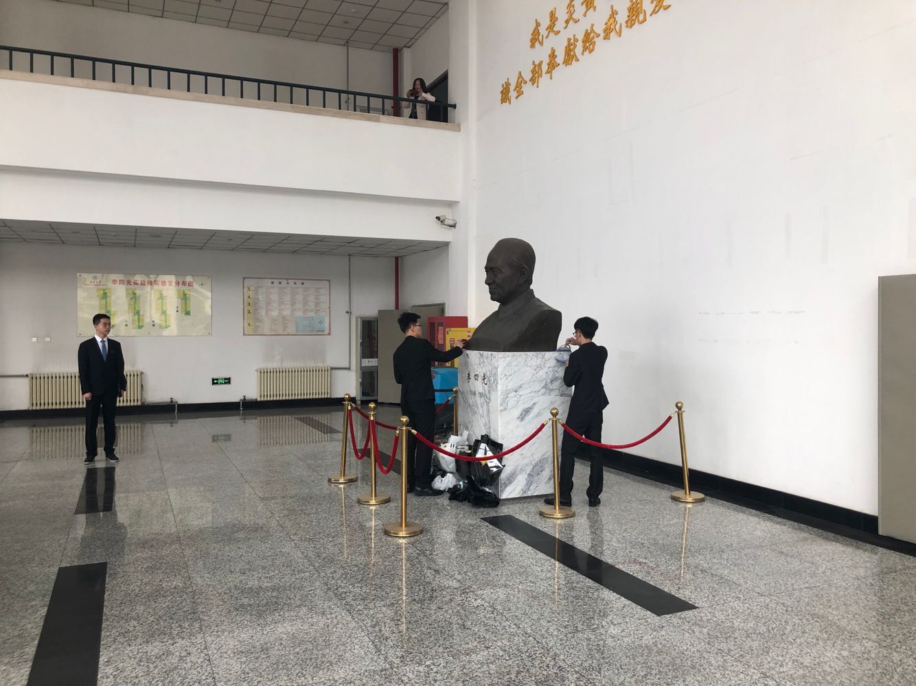 上午9时,学生代表们身着正装在李四光实验楼前集合。大家一同来到李四光雕像前,学生代表首祁鑫先追忆李四光先生的主要事迹,表达对李四光先生的缅怀之情和学习李四光精神的决心。同学们肃立站在李四光雕像前,为李四光先生默哀三分钟,深刻体会李四光精神,满怀对李四光先生的敬仰之情。致辞结束后,在同学们的注视下,学生代表向先驱雕像献花,全体同学庄重肃穆地对先驱雕像进行鞠躬,表达了对先驱最崇高的敬意,表达了对李四光先生的敬意和缅怀之情。活动最后,志愿者们仔细认真的清理了李四光先生的雕像。