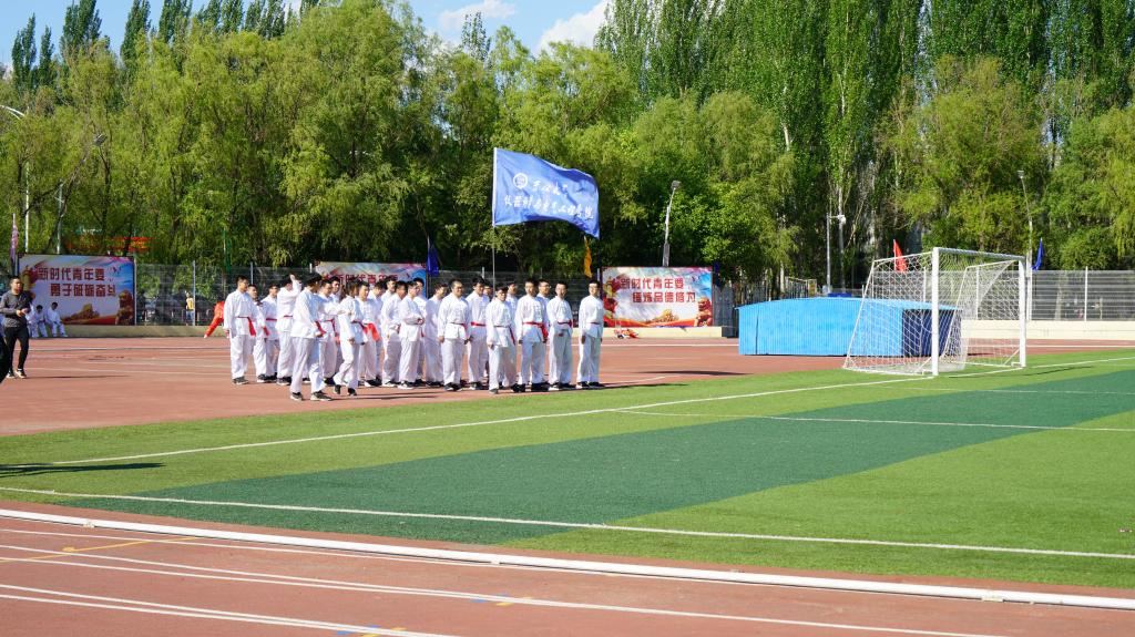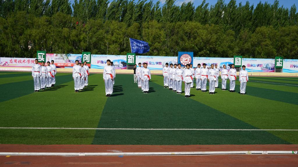 5月24日,决赛如期而至。迎着初升的阳光,长拳队员们早早地在体育场边集合完毕,渴望在全校师生和领导面前展现他们的风采。有了初赛的经验,长拳队员们毫不胆怯,队员们相互鼓劲。随着总指挥一声令下,队员们迈着坚定的步伐步入了绿茵场。一招一式刚劲有力,动作整齐划一,看台上不时发出欢呼和掌声。台上一分钟,台下十年功,同学们夜以继日的练习在今天得到了回报。表演完毕后,同学们再一次行抱拳礼。