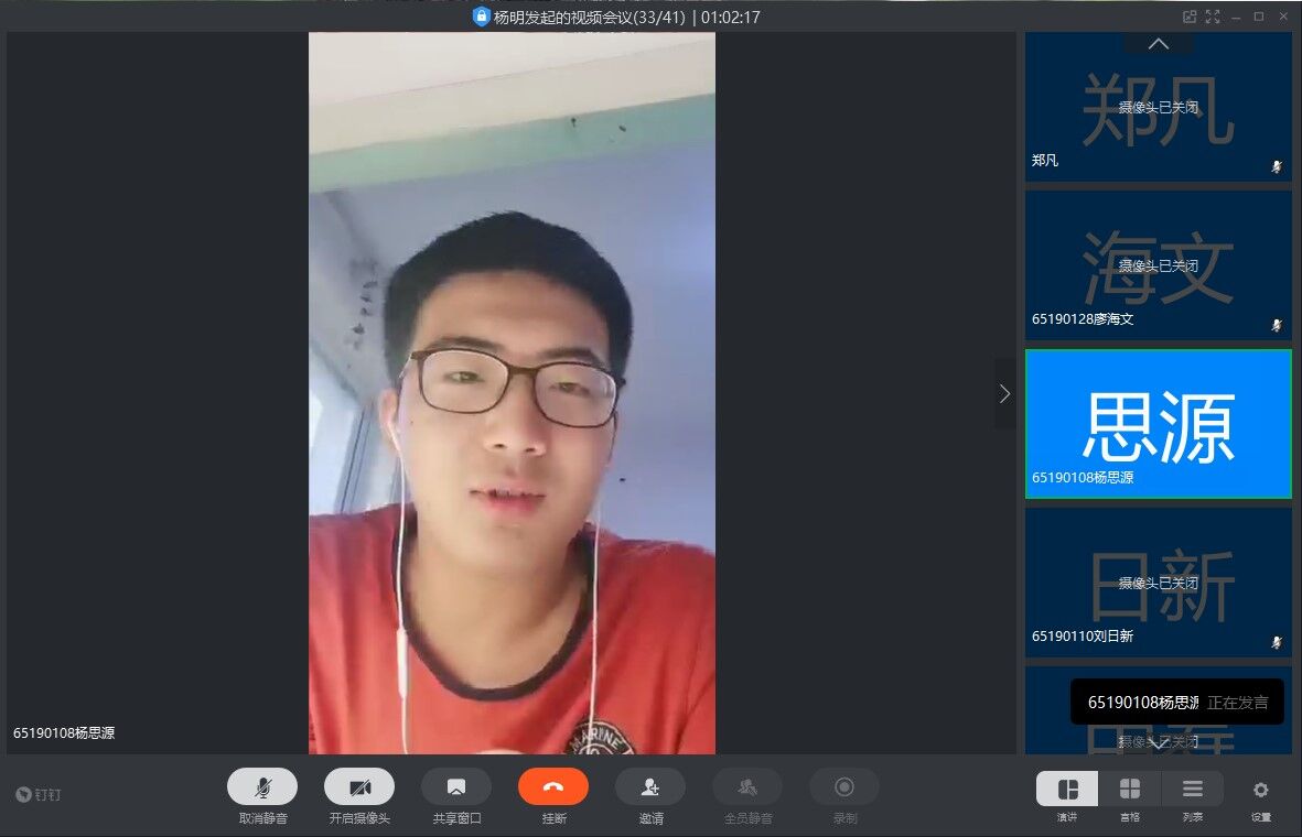 期末在即,为帮助同学们在疫情期间树立正确的学习态度,解决同学们的学习困难,掌握适合自己的学习方法,培养良好的学习习惯,651901班于2020526日晚1930利用钉钉直播开展“仪电少年,‘疫’起学习”主题班会,本次班会由班长杨明主持,并邀请到651901班班主任王智宏老师、郑凡老师以及辅导员马姗姗老师出席班会。