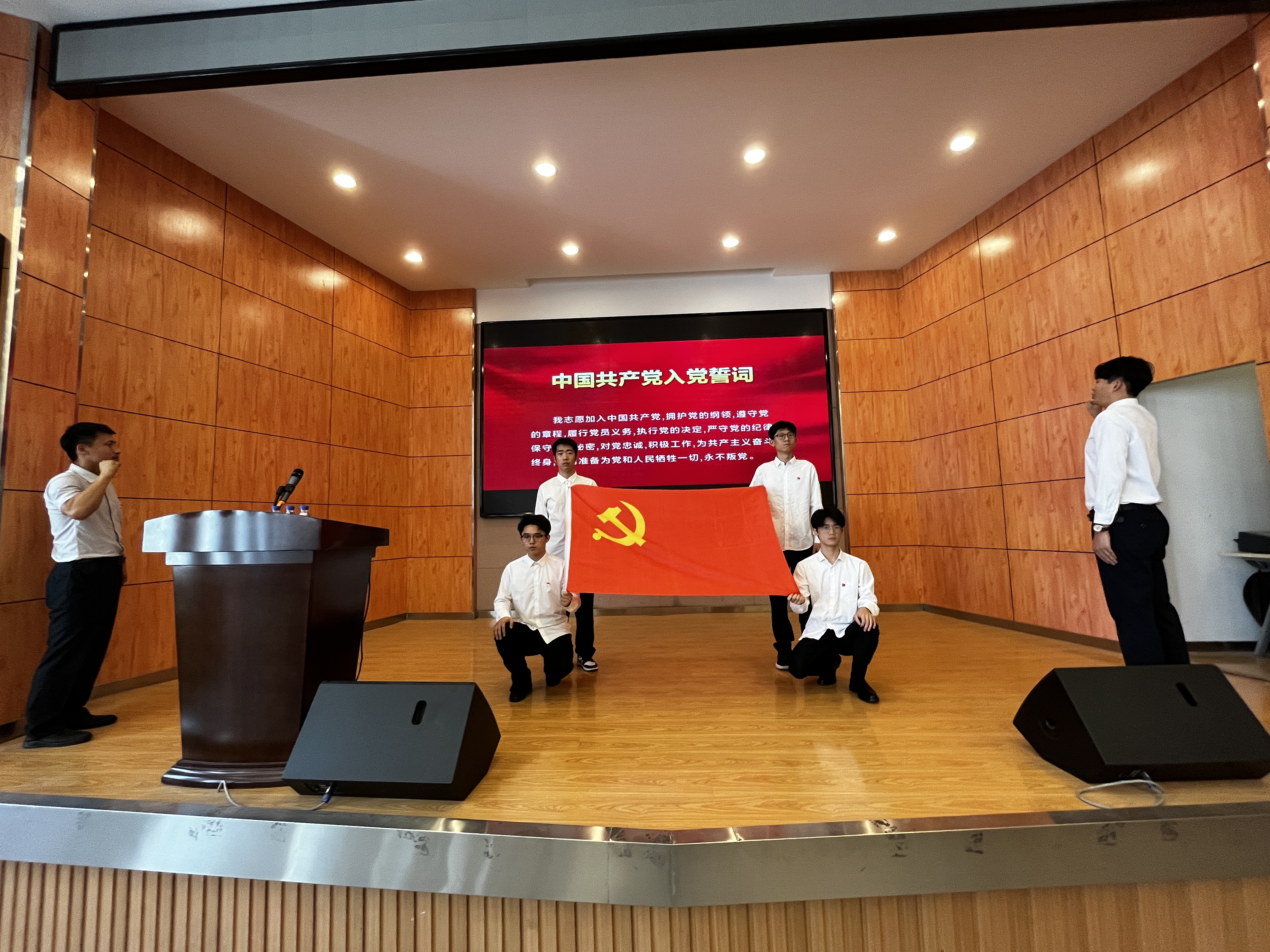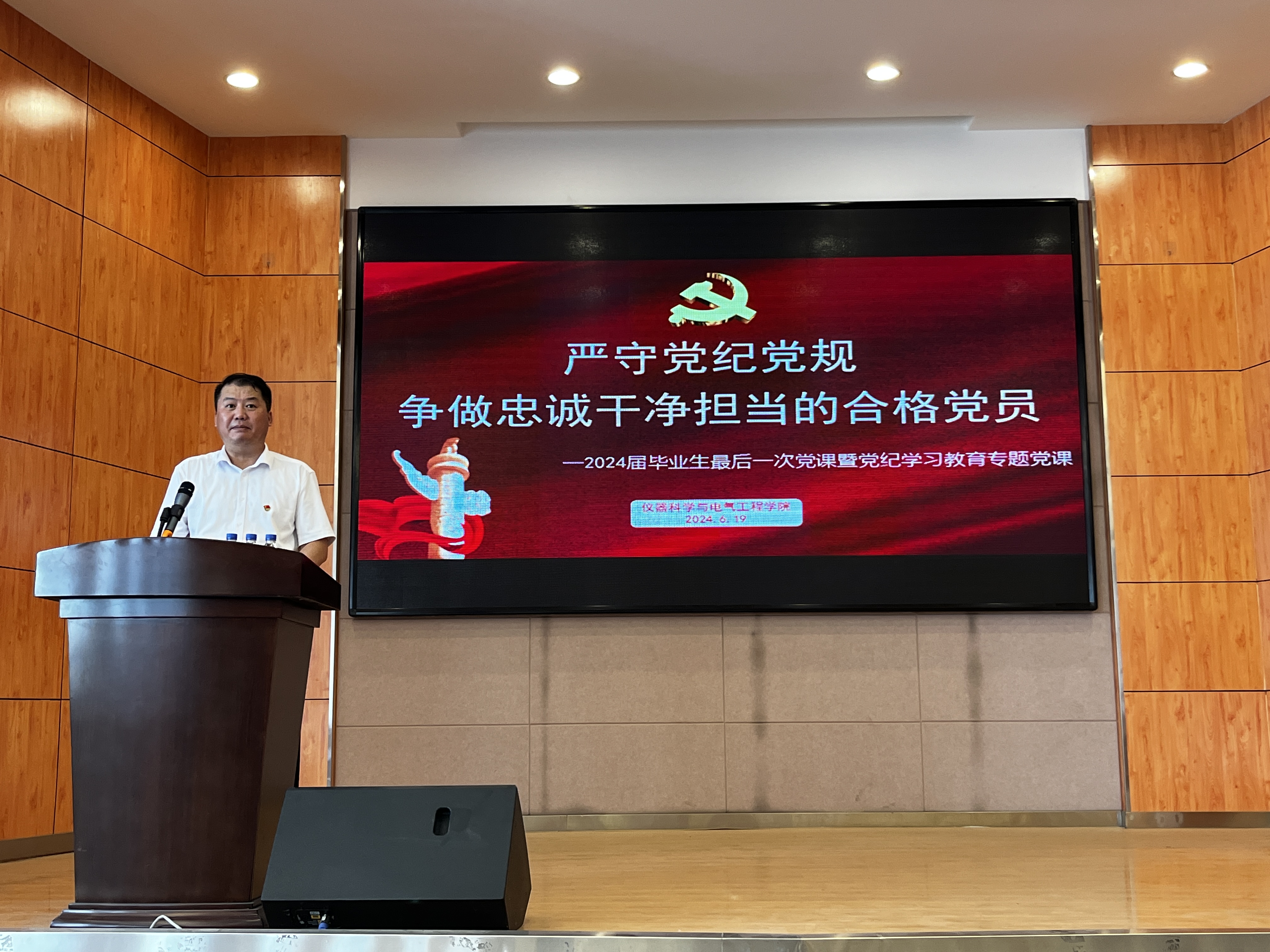 党委书记邱增凯在朝阳校区图书馆李四光厅为学院全体毕业生党员讲授最后一次党课。本次活动由学院行政副院长南旭良主持,学院全体本科生、研究生毕业生党员参加活动。