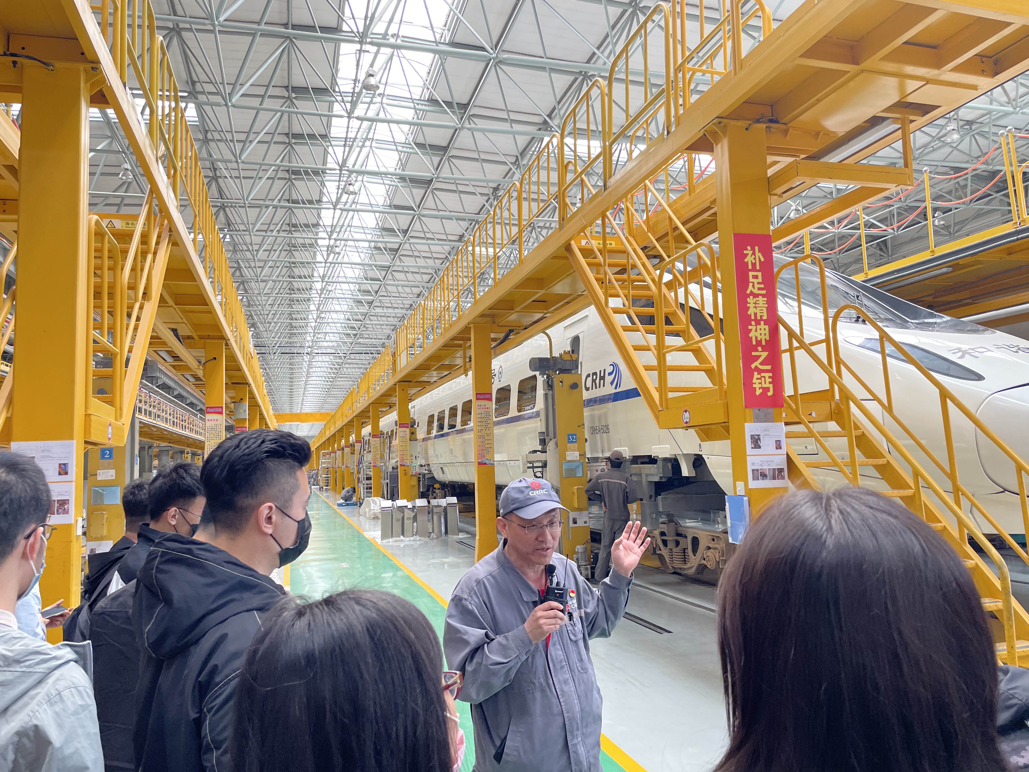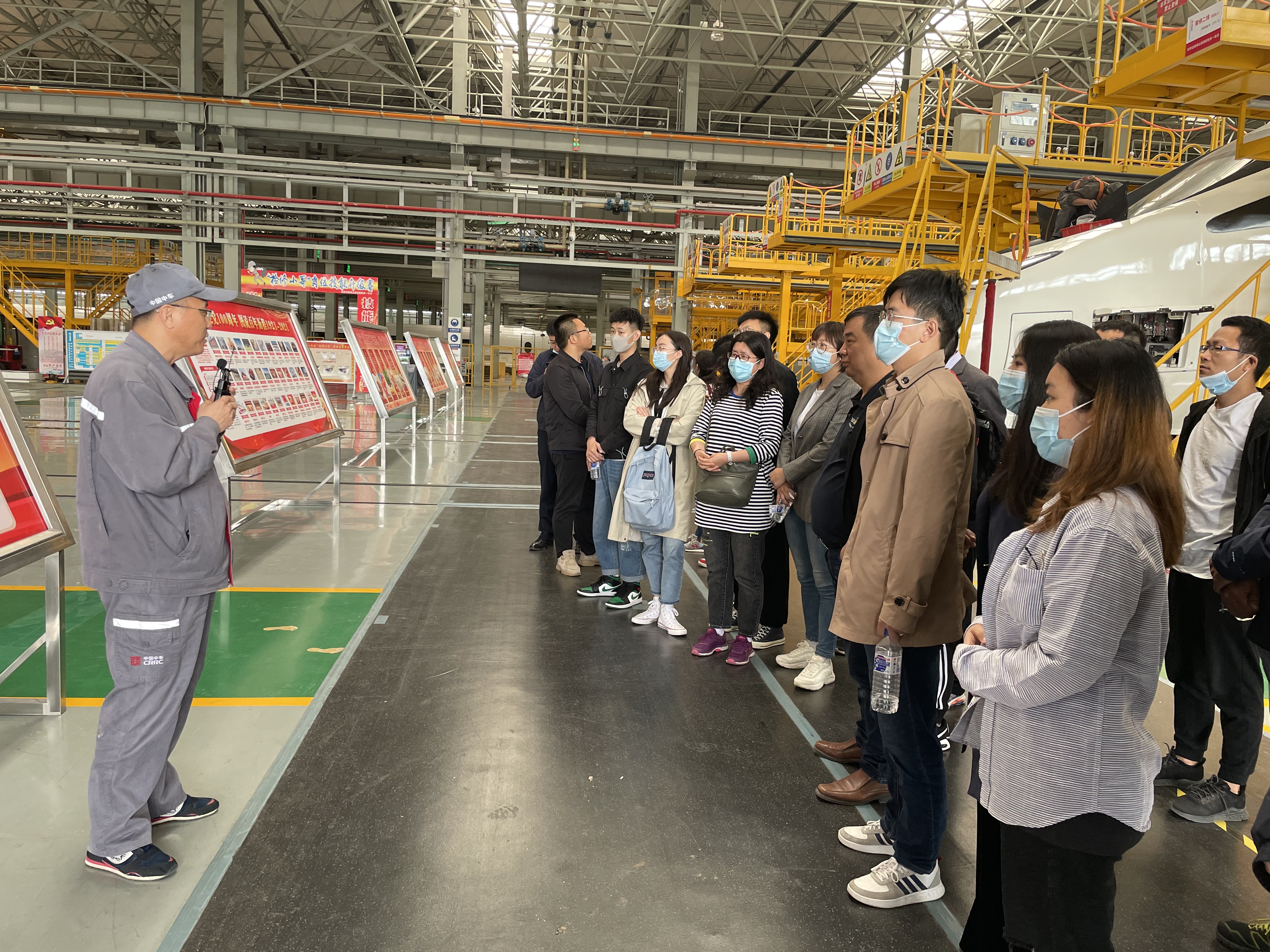 学生重要的就业基地,它的前身为长春客车厂,始建于1954年,是国家“一五”重点建设项目之一。2002年3月改制为股份公司。长客检修基地具备年检修300列动车组及1000辆普通铁路客车的能力,宋会军详细讲解了新厂区的规划建设情况、长客的发展史、高铁的生产流程、生产工艺等,重点介绍了检修基地是以服务为导向、安全可靠和成本最优的状态修运维模式,构建产品全寿命周期服务体系,输出可复制的检修运维业务模板,打造具有全寿命周期服务国际竞争力的检修运维现代化企业。具有年300列高速动车组检修、1000辆铁路客车检修、500辆铁路客车新造的生产能力,努力实现年产值100亿元。在检修车间,全体党员参观了部分正在检修的高速动车组,为中国制造感到骄傲。