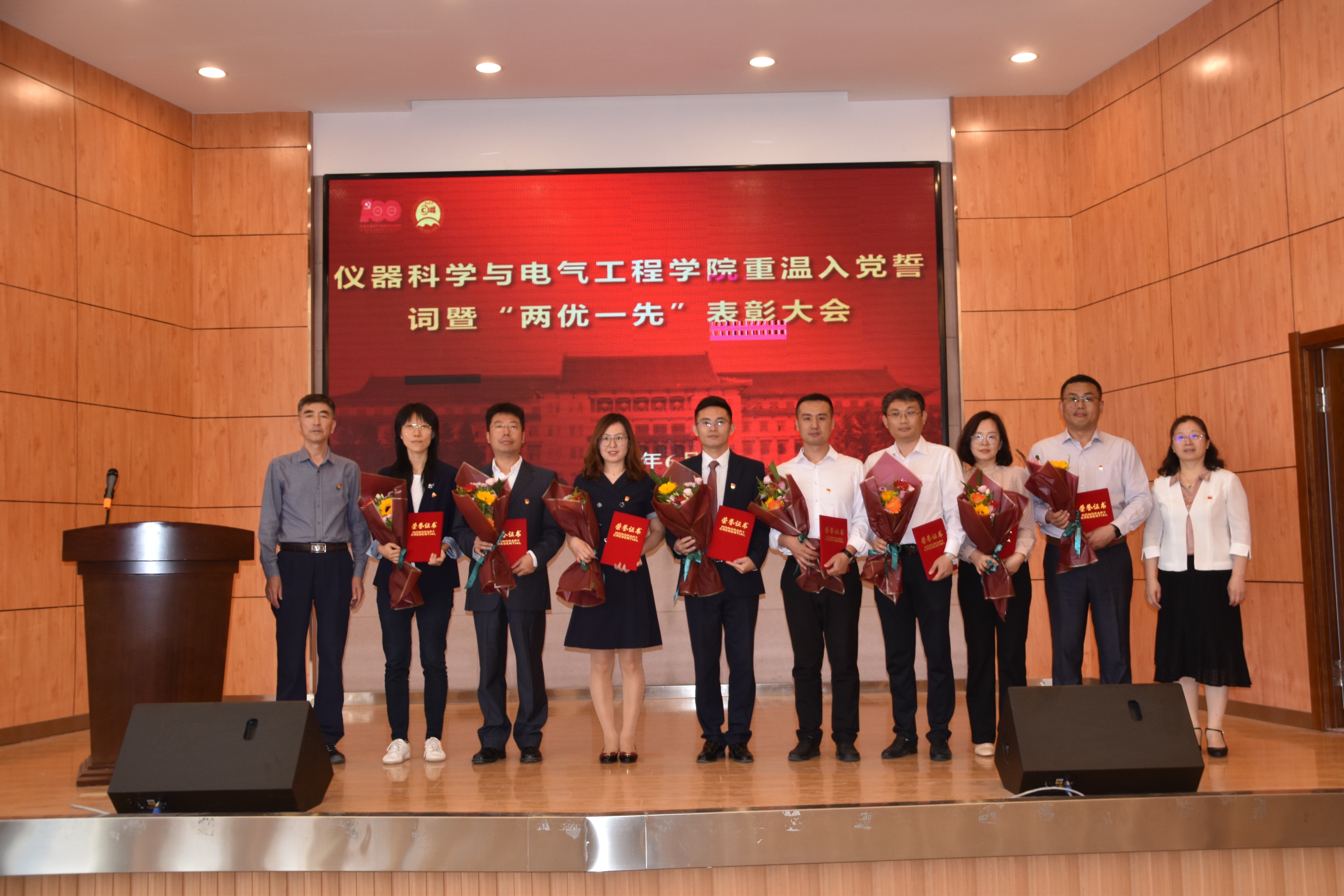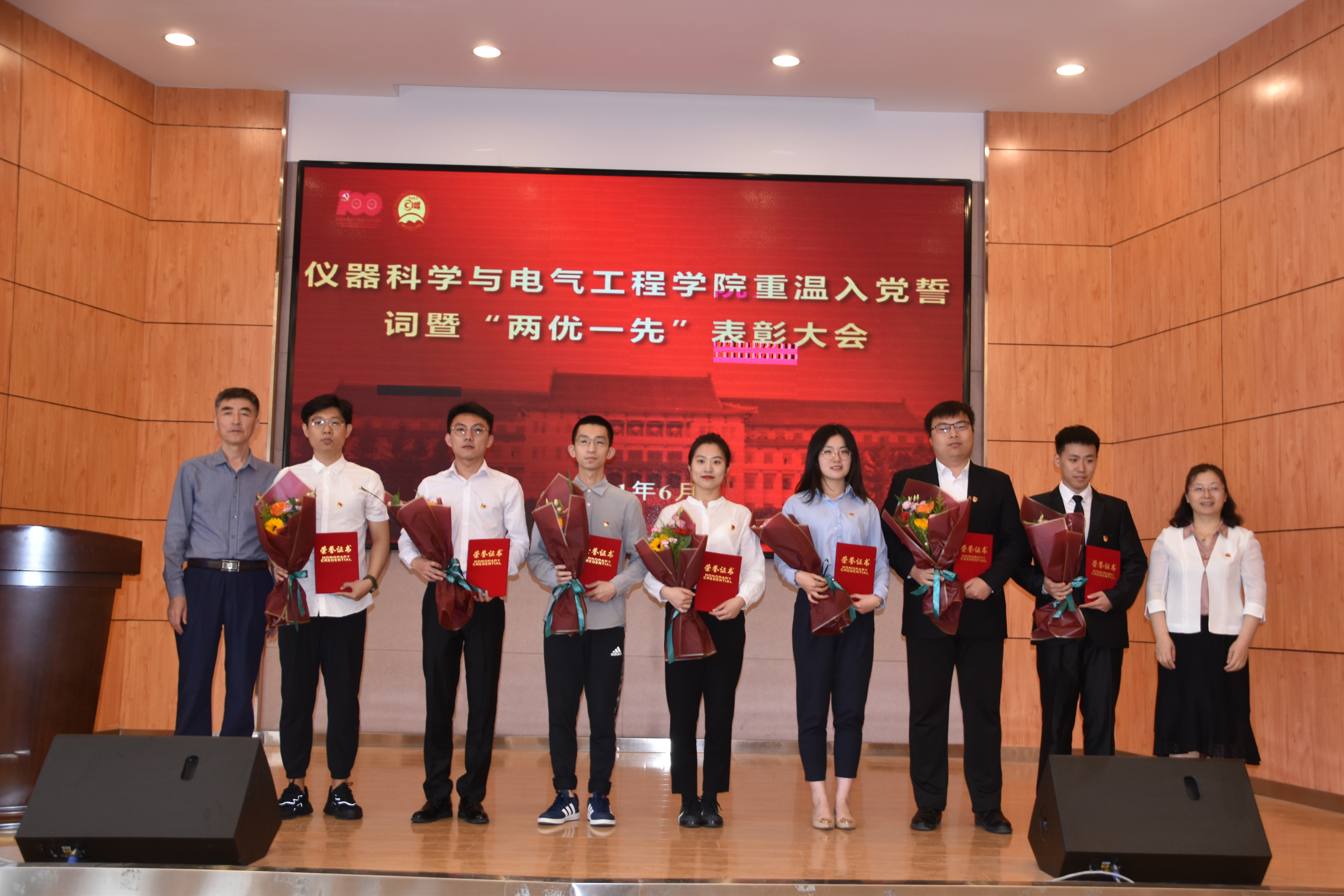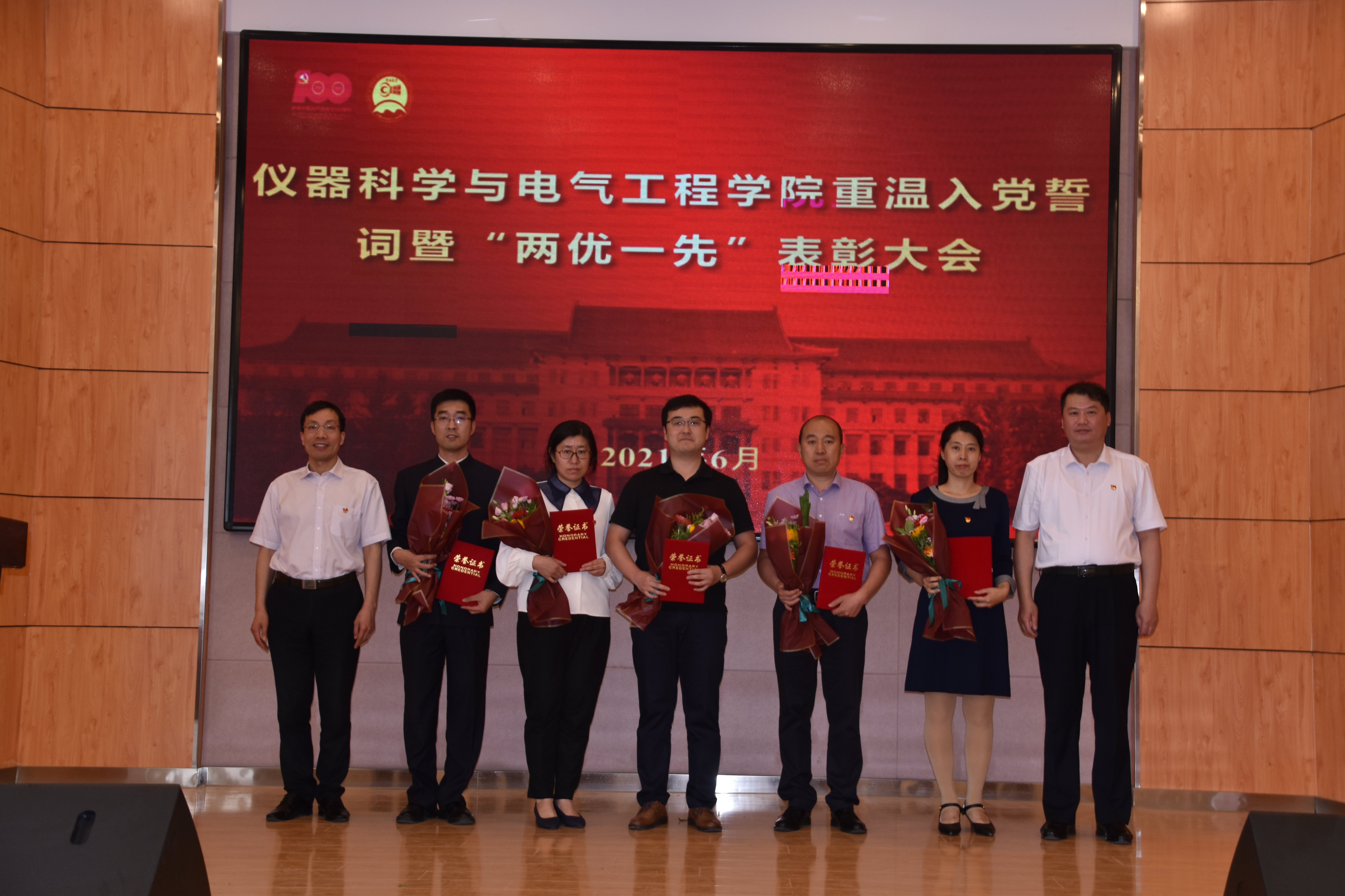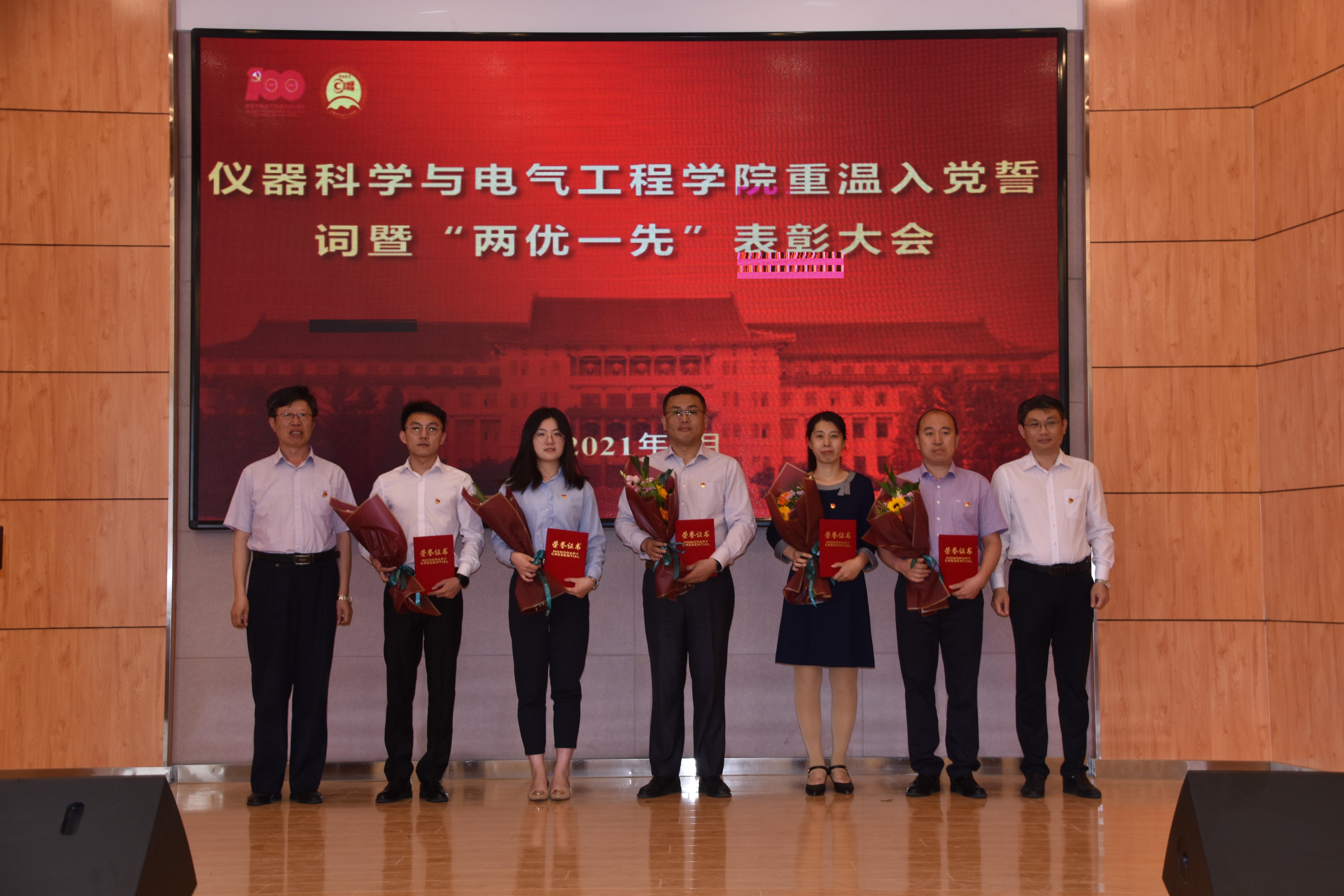 与电气工程学院党委书记邱增凯与党委委员陈祖斌为获得“优秀党务工作者”荣誉称号的6名突出个人颁发证书及鲜花;污污漫画